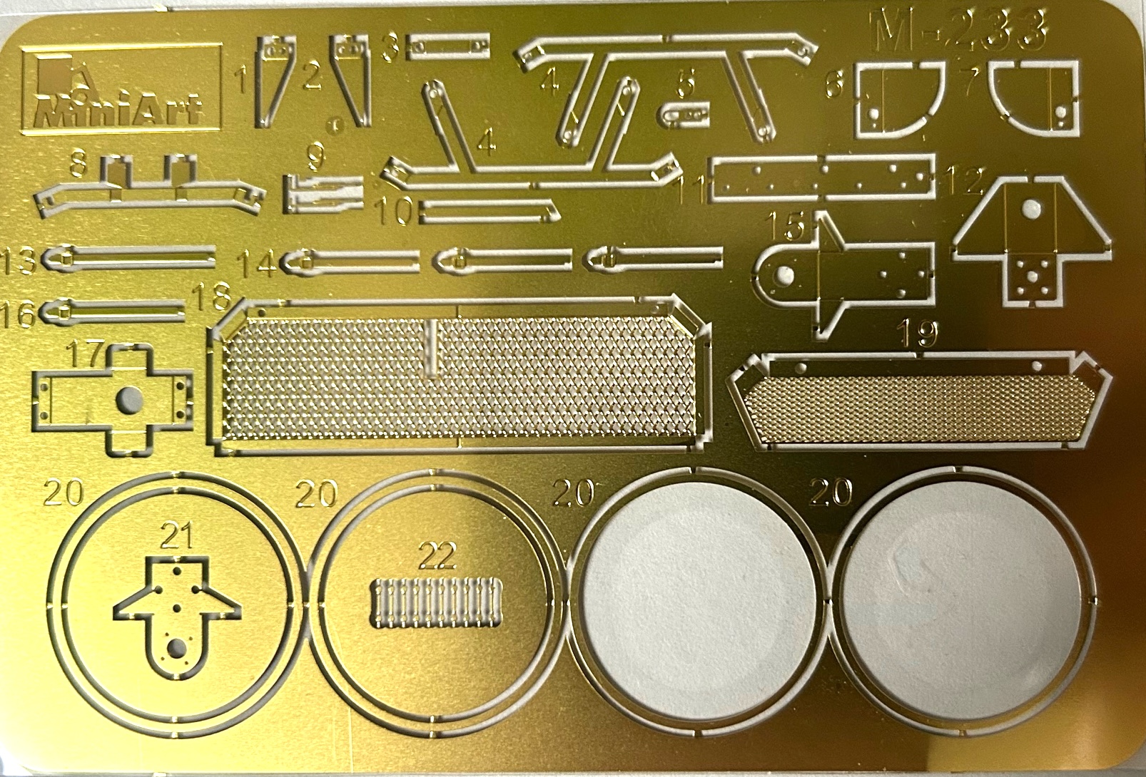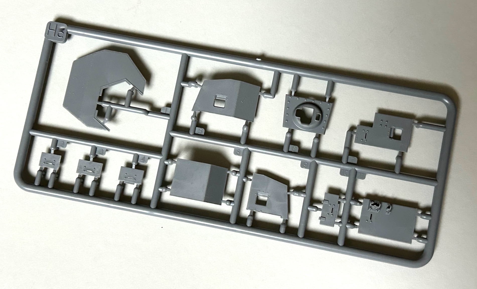 Alle Bordwerkzeuge sind separat und sauber ausgeführt und für die Abweiser der Scheinwerfer erhält man passende Ätzteile, mit deren Hilfe man die Gitter maßstabsgerecht umsetzen kann. Die Hauptwaffe mit dem koaxialen MG bestehet aus mehr als 20 Teilen und dies ermöglicht damit eine präzise Wiedergabe des Originals. Das Hauptgeschütz ist dann in den asymmetrischen hexagonalen Turm zu verbauen. Für die Sichtblöcke im Turm liegen die Glasblöcke als Klarsichtteile bei.