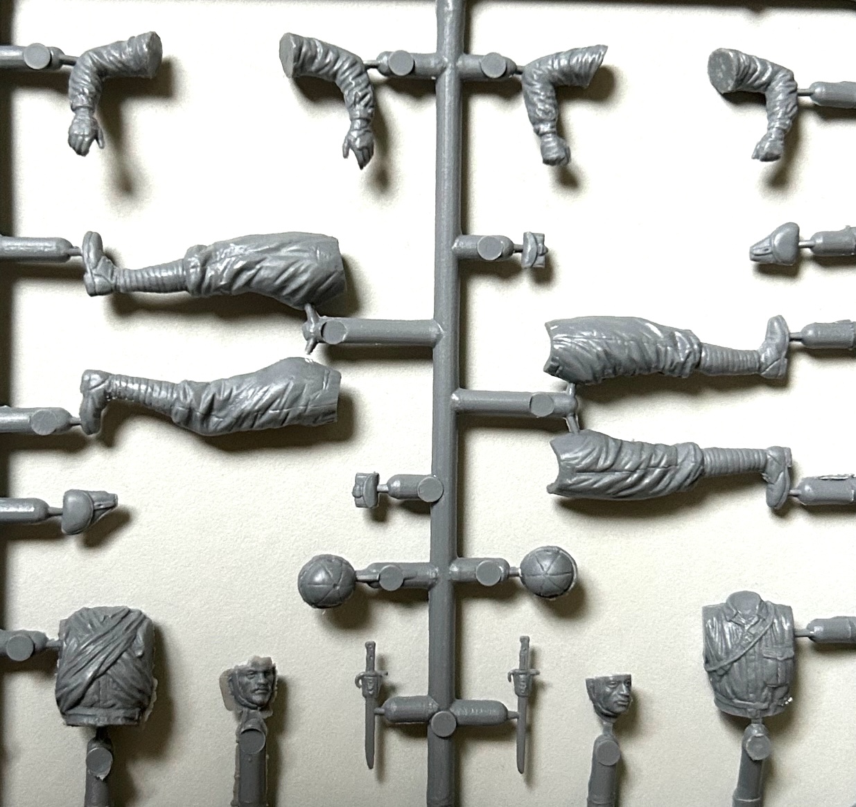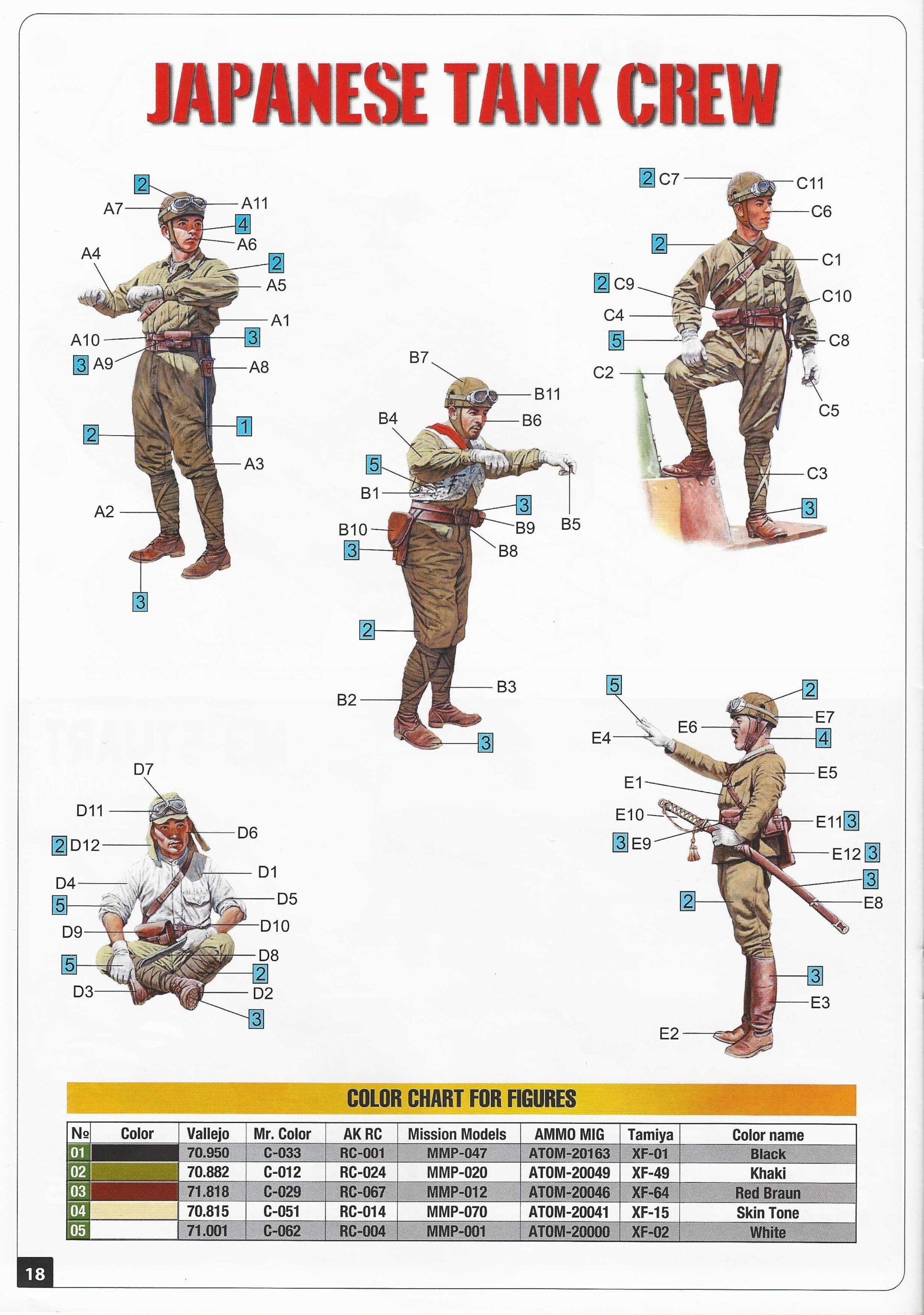 Der Figurenbausatz: Dem Bausatz liegen noch zwei Spritzgussrahmen für den Bau der vier Figuren bei. Drei der Figuren repräsentieren die Panzerbesatzung in typischen Uniformen mit Panzerhelmen. Die Teile sind sauber gestaltet und weisen einen schönen Faltenwurf der Uniformen und Details auf. Sehr gut gemacht ist auch die Idee, eine der beiden stehenden Figuren mit einer japanischen Flagge, die um den Oberkörper gewickelt ist, darzustellen. Ebenso realistisch wirken die im Schneidersitz dargestellte Figur und der stehende Offizier mit seinem Samuraischwert.