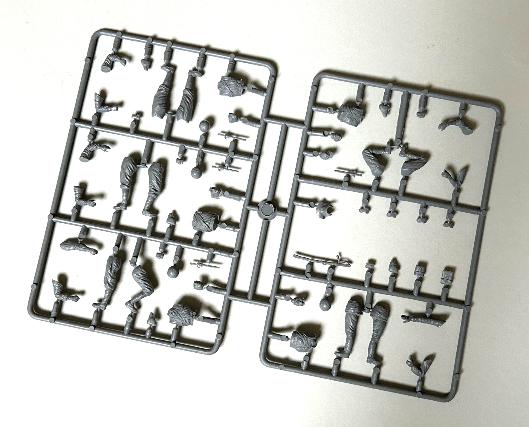 Der Karton ist mit 15 grauen und einem klaren Gussast gut gefüllt, wovon zwei der Gussäste den vier beiliegenden Soldatenfiguren gewidmet sind. Darüber hinaus liegen noch ein Bogen mit Ätzteilen, die Abziehbilder sowie der Bauplan bei.