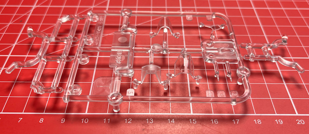 Aus vier Teilen besteht die Cockpitverglasung. Eine „Panzerglasscheibe“ wird von innen an die Frontverglasung geklebt. An dieser ist noch ein Stück Rumpf anmodelliert. Das vereinfacht das Ankleben und Ausrichten der Verglasung. Die im Original zu öffnende Cockpithaube gibt es hier als Einzelteil. Diese Option wird aber in der Bauanleitung nicht gezeigt. Aus dem Klarsichtmaterial kann man eine Halterung für die 262 zusammenbauen. Hier kann die Maschine abgelegt werden, wenn das zusammengeklebte Fahrwerk aushärtet. Übrigens liefert ArmaHobby gelbe Masken für die Räder und Klarsichtteile mit.