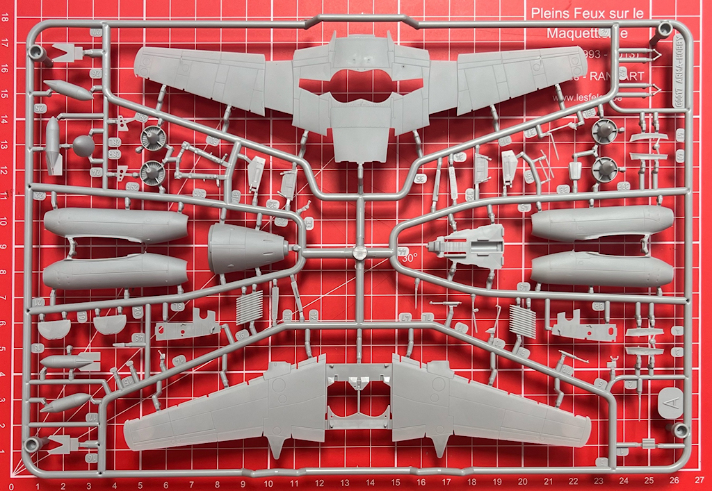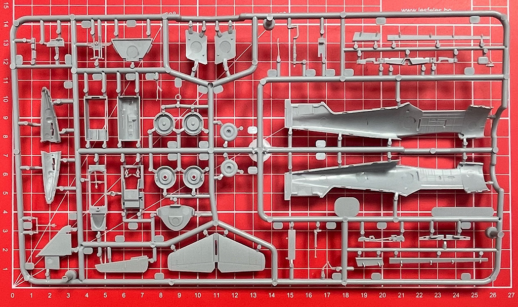 In der attraktiven, aber sehr unpraktischen Schüttbox befinden sich gut verpackt zwei hellgraue Spritzgussrahmen mit 99 Teilen, ein Klarsichtrahmen mit sechs Teilen, gelbe Masken, ein Decalbogen, drei Stahlkugeln und die mehrfarbige Bau- sowie Bemalungsanleitung.