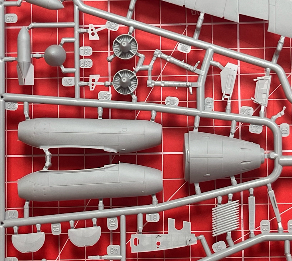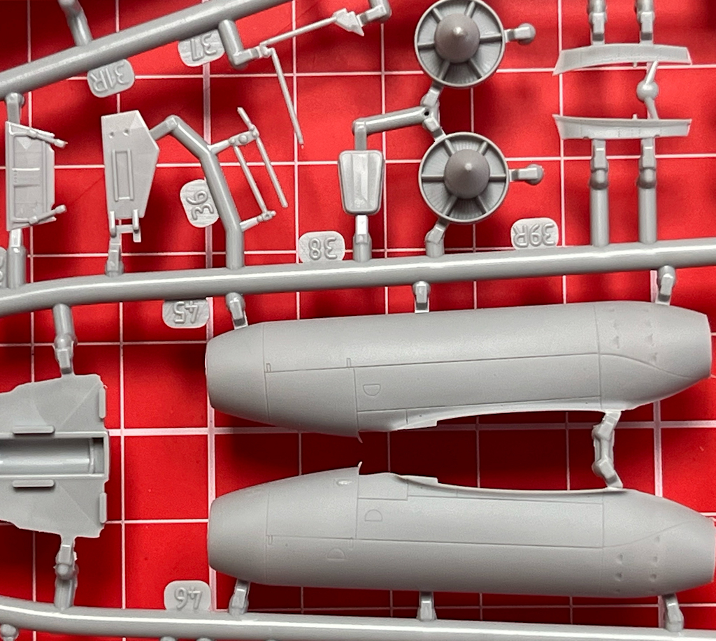 Für die zwei Triebwerksgondeln werden nur jeweils vier Teile zusammengefügt. Diese sind aber sehr gut gelungen. Die beiden Fahrwerksbeine müssen mit den Fahrwerksscheren versehen werden. Diese sind sehr fein. Hier sind keine Fotoätzteile nötig. Die beiden Hauptfahrwerksräder besitzen ein schönes Profil aber sie werden aus zwei Teilen zusammengeklebt, und dadurch werden sie nicht optimal aussehen. Bestimmt gibt es bald im Zubehörhandel Ersatz, oder nutzt Räder von bekannten Herstellern. Die Fahrwerksklappen besitzen von innen eine vorbildgerechte Oberfläche.