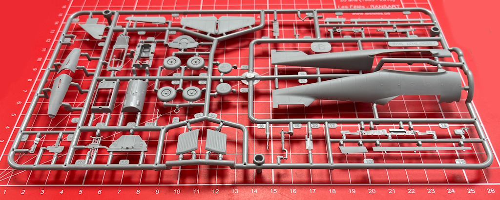 Danach erfolgt der Zusammenbau des einsitzigen Cockpits. Hier sind nicht weniger als 14 Teile zu verbauen. So ein fein detailliertes Cockpit nur aus Spritzgussteilen ist mir noch nicht untergekommen. Hier wurde auch Einiges sinnvoll zusammengefasst. Für die Instrumente und die Sitzgurte gibt es Decals. An den Cockpitseitenwänden werden noch weitere Details angeklebt.