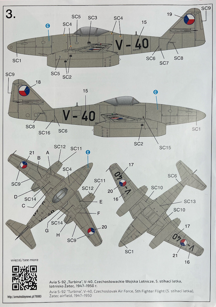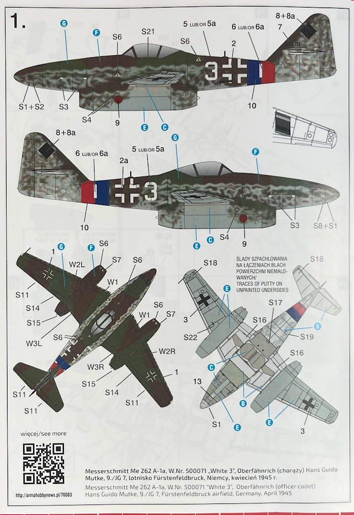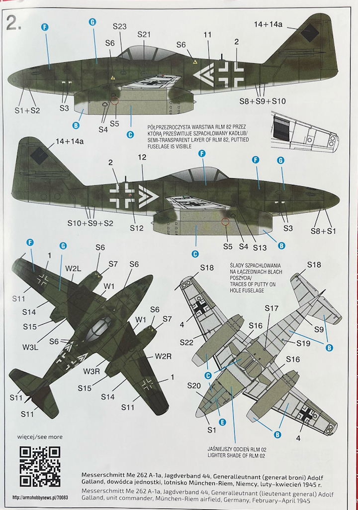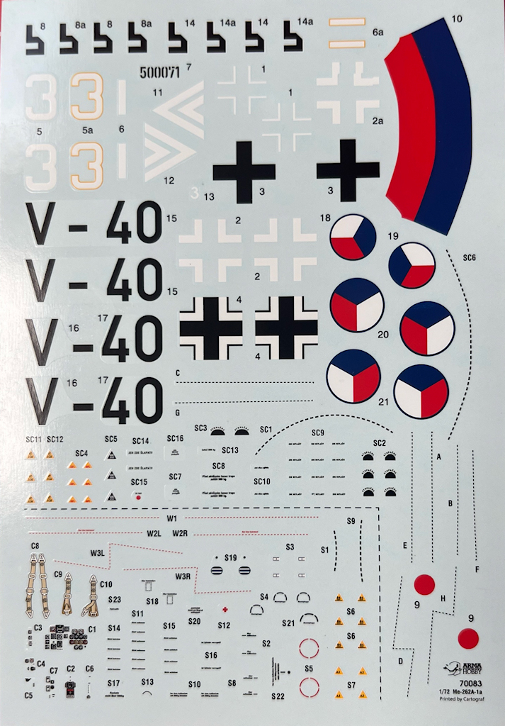 Bei den Farbangaben bezieht sich ArmaHobby auf die Systeme von Hataka, AK, Mr Paint, Humbrol, Mr. Color, Vallejo und Tamiya. Gleichzeitig werden auch die RLM-Farbtöne angegeben. Die Decals sind tadellos auf hellblauem Trägerpapier gedruckt. Es gibt hier vermutlich alle Wartungshinweise der Me 262.