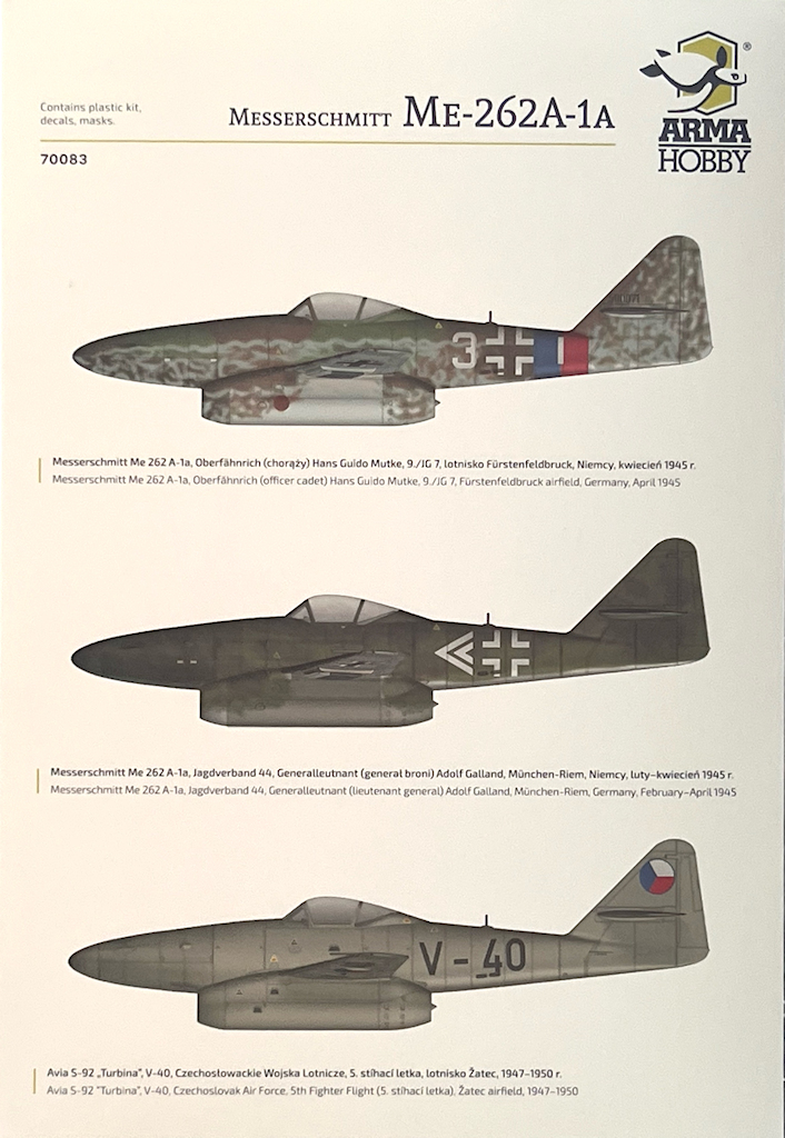 Bausatz: Jeder renommierte Bausatzhersteller möchte gern eine Messerschmitt Me 262 im Angebot haben. ACADEMY, Airfix, Hasegawa, Heller und Revell haben (oder hatten) einen Kit in 1/72 im Angebot. Bei KORA hat man die Me 262 V1/V3/V4 in verschiedenen Kartons im Programm. So verwundert es nicht, dass nun auch bei ArmaHobby eine Me 262 in der A-1a-Variante im Angebot hat.