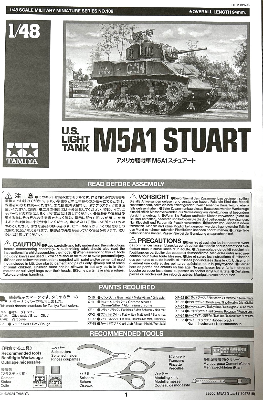 Der Bausatz: Tamiya veröffentlichte 2024 einen weiteren Bausatz aus der Reihe leichte amerikanische Panzer im Maßstab 1:48. Neben dem M8 Howitzer kann man nun endlich auch ein ansprechendes Modell des leichten Panzers M5A1 Stuart bauen.