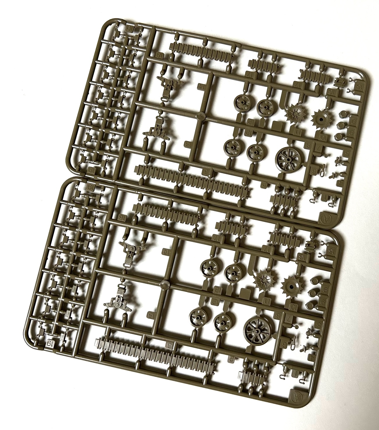 Die Gussäste A mit Teilen für das Laufwerk (Laufräder, Antriebs- und Leiträder sowie Kettenteile) und B für die Wanne kennt man bereits vom Bausatz des M8. Völlig neu ist jetzt der Gussast D mit allen Teilen vom Aufbau und dem Turm für den M5A1.