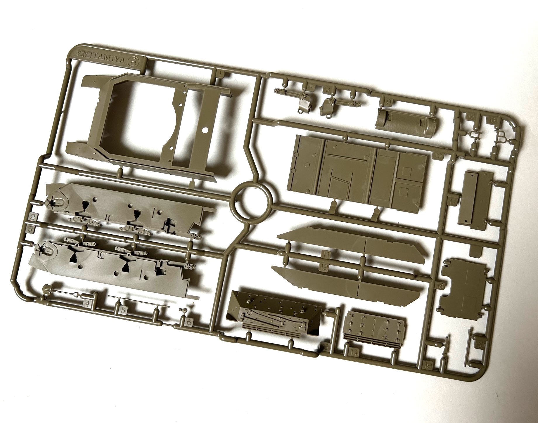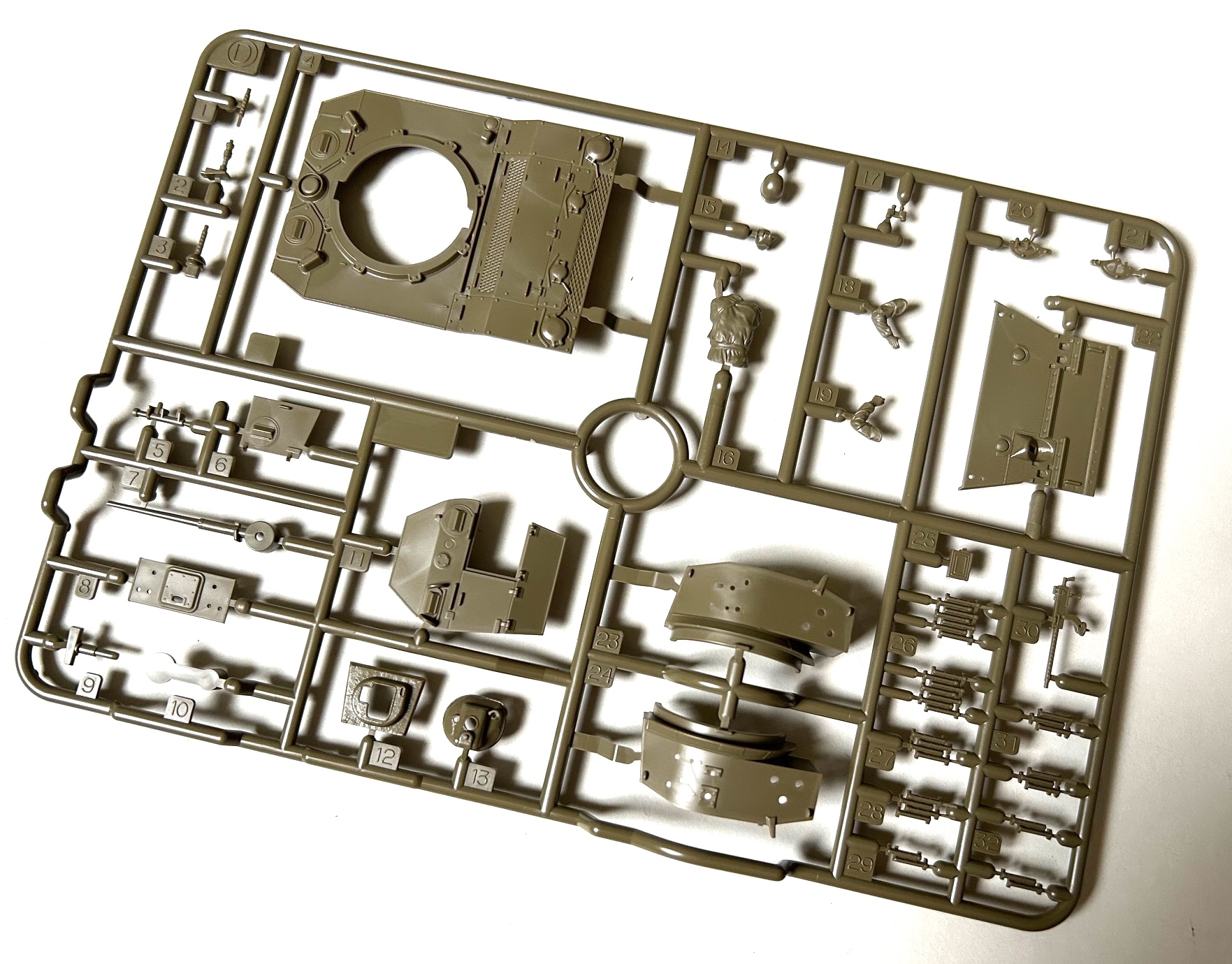 Wenn man sich die einzelnen darauf befindlichen Teile genauer ansieht, kann man schnell erkennen, dass beim Design Profis am Werk waren. Oder anders gesagt: Es sieht alles sehr nach Tamiya aus! Keine verwaschenen sondern absolut gestochen scharfe Details, die insbesondere auf der Wannenoberseite und dem Turmdach auffallen. Ebenso beeindruckend gestaltet, ist das in diesem Maßstab sehr kleine Browning MG. Und schließlich sind da noch das Rohr der Hauptwaffe und die Antennenhalterung die mit Hilfe des Slide Mold Verfahrens, sogar Öffnungen aufweisen.