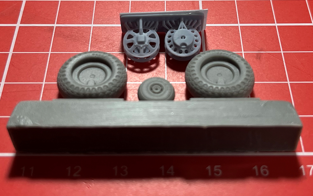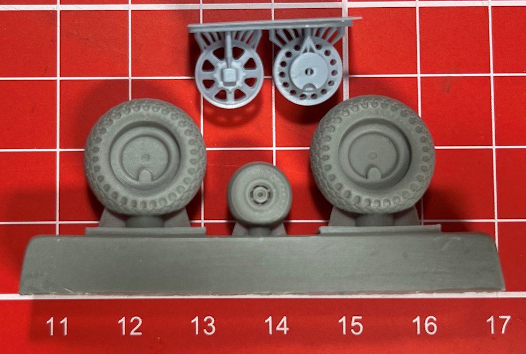 Der Guss der Resinteile ist tadellos. Die Hauptfahrwerksreifen besitzen ein Rautenprofil. Dieses wird leider an der Unterseite durch die Angüsse beeinträchtigt. Die Felgen wurden gedruckt. Sie werden dann in die Räder eingeklebt.