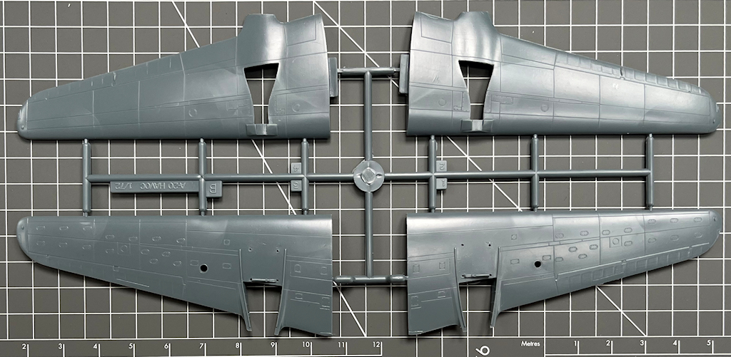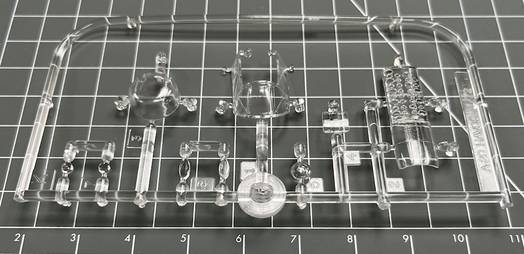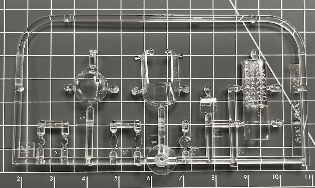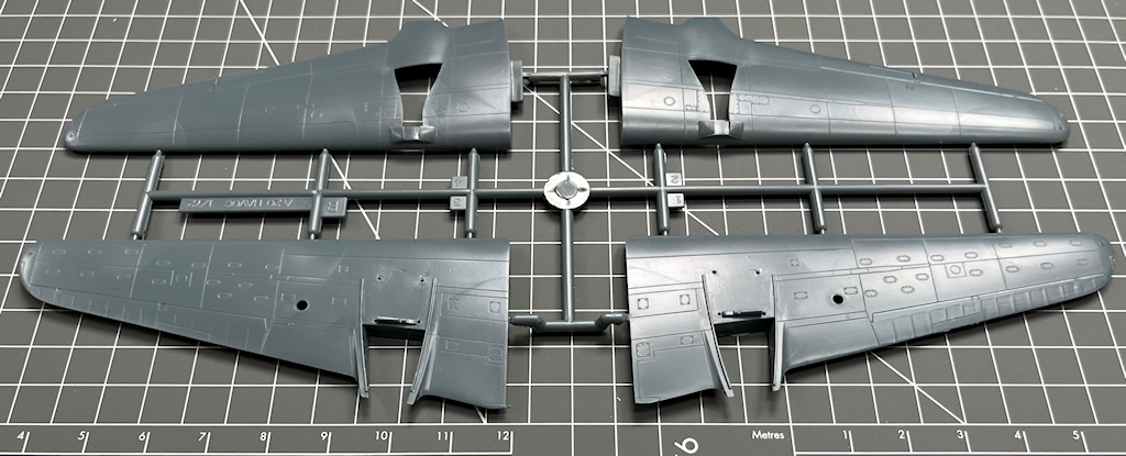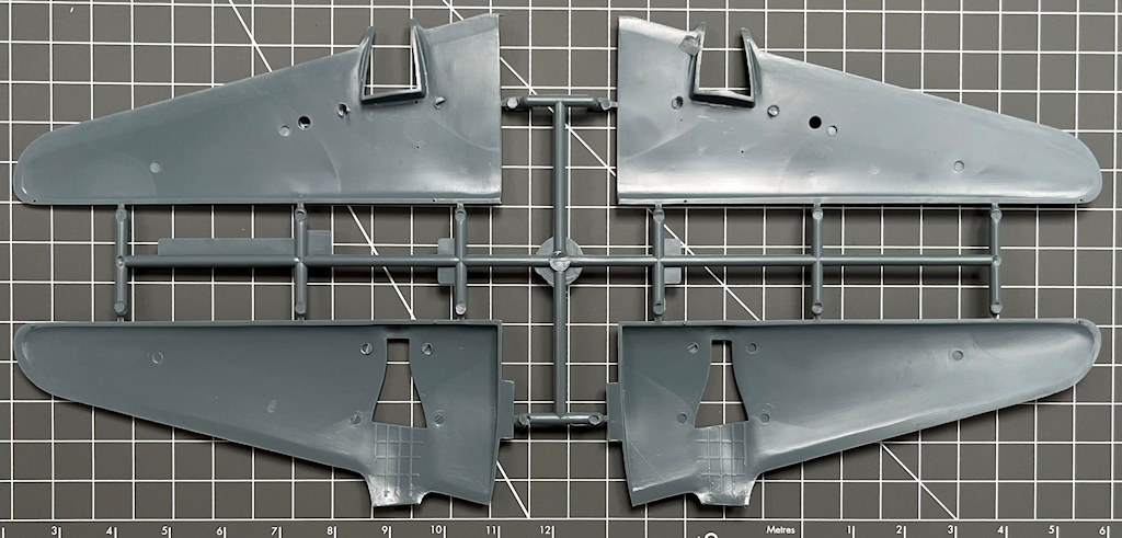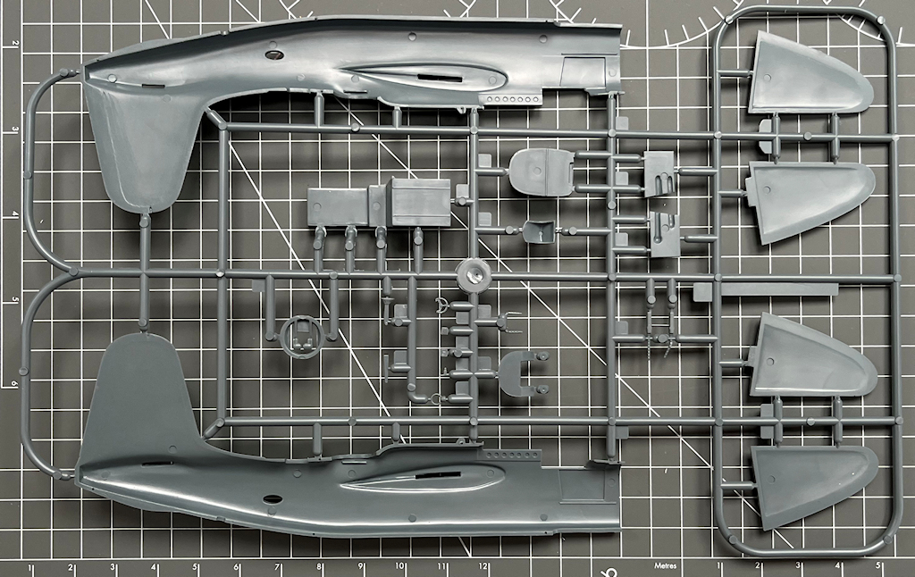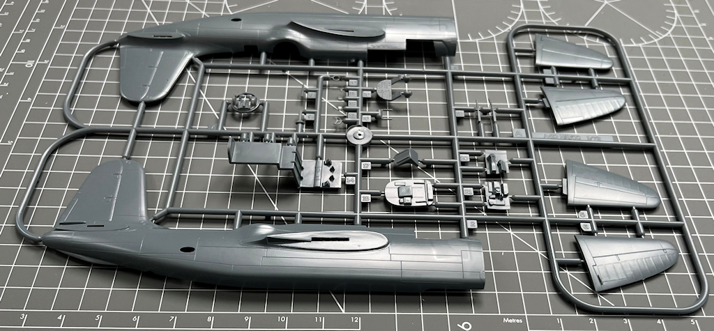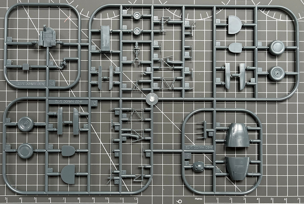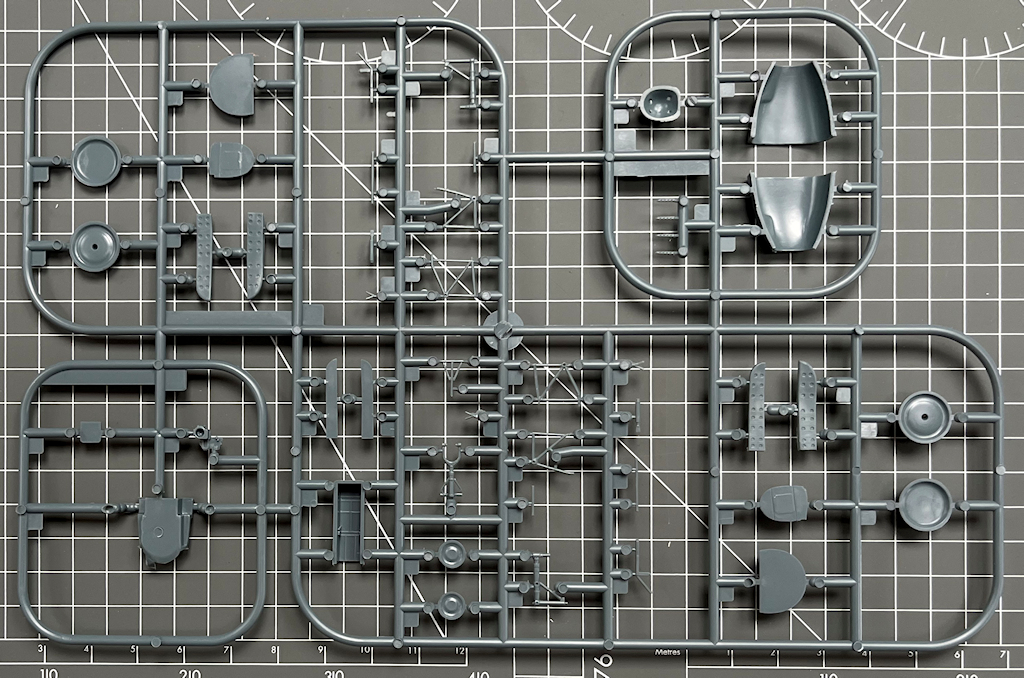 Die vier hellgrauen Spritzrahmen beinhalten recht ordentliche Bauteile. Diese besitzen feine Gravuren. Alle Teile sind sauber abgespritzt. Man vermisst ein paar Details wie z.B. Sitzgurte und ein Decal fürs Instrumentenbrett. Die Kleinteile sind recht grob. Interessant ist für mich, dass die Seitenkonsolen im Cockpit separat eingeklebt werden.