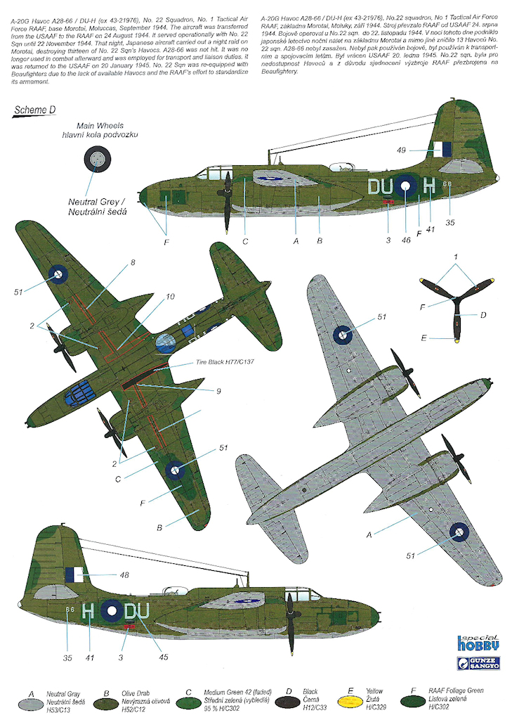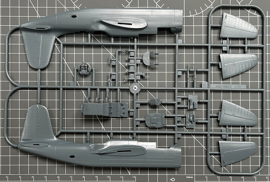 Bausatz: Seit 2007 hat die MPM/Special Hobby-Gruppe die Douglas A-20 im Maßstab 1/72 in verschiedenen Versionen auf dem Markt gebracht. Es war damals einer der ersten Bausätze aus einer Metallform. Damit war die A-20G in 1/72 geboren. Teilweise lagen dem Kit bei einigen Auflagen Fotoätzteile von Eduard bei. 2023 wurde die A-20G zuletzt aufgelegt. Nur knapp drei Jahre später folgte diese Auflage mit neuen Decals.