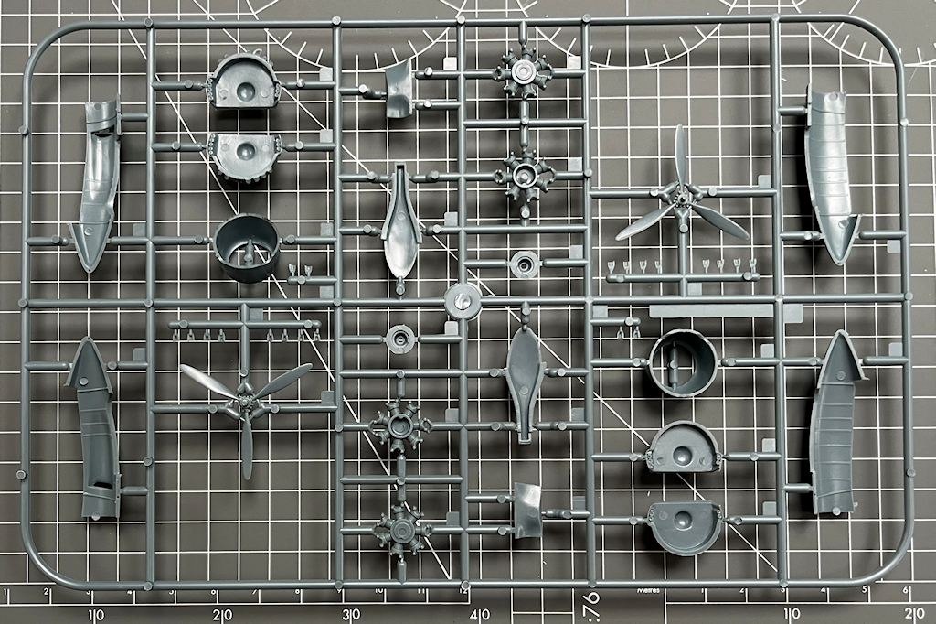 Die Detaillierung der Fahrwerkschächte geht schon in Ordnung. Die Fahrwerksscheren aus Kunststoff könen durch feinere aus Fotoätzteilen ersetzt werden. Alle anderen Details beim Fahrwerk sind in Ordnung. Bei den Sternmotoren sind neben zwei Sternen noch die Getriebegehäuse anzukleben. Alles verschwindet hinter einer einteiligen Motorhaube. Hier sind jeweils die Entlüftungshutzen einzeln anzukleben. Das ist eine Fleißarbeit. In der Bauanleitung erklärt Special Hobby wohin jede Hutze gehört!
