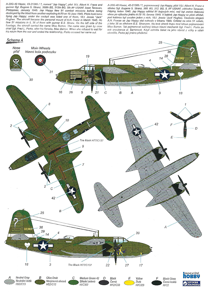 - A-20G-40, 43-21385/?, von 1/Lt. Albert H. Franz und Sgt. Eugene S. Stranz, 388.BS, 312.BG, 5.AF, USAAF, Philippinen im Januar 1945;