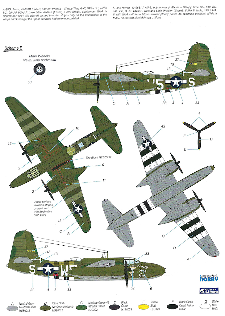 - A-20G, 43-9881/W5-S, „Wanda – Sleepy Time Gal”, 640.BS, 409.BG, 9.AF, USAAF, Little Walden (Essex), Großbritannien im September 1944;