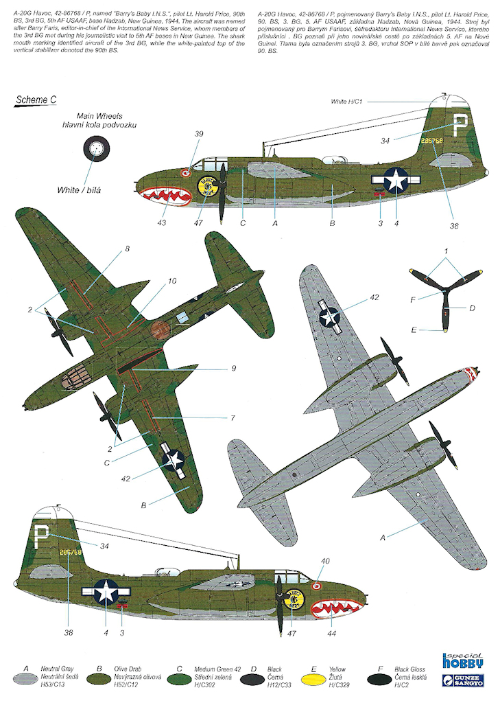 - A-20G, 42-86768/P, “Barry’s Baby I.N.S” von Lt. Harold Price, 90.BS, 3.BG, 5.AF, USAAF, Nadzab, Neu Guinea, 1944;
