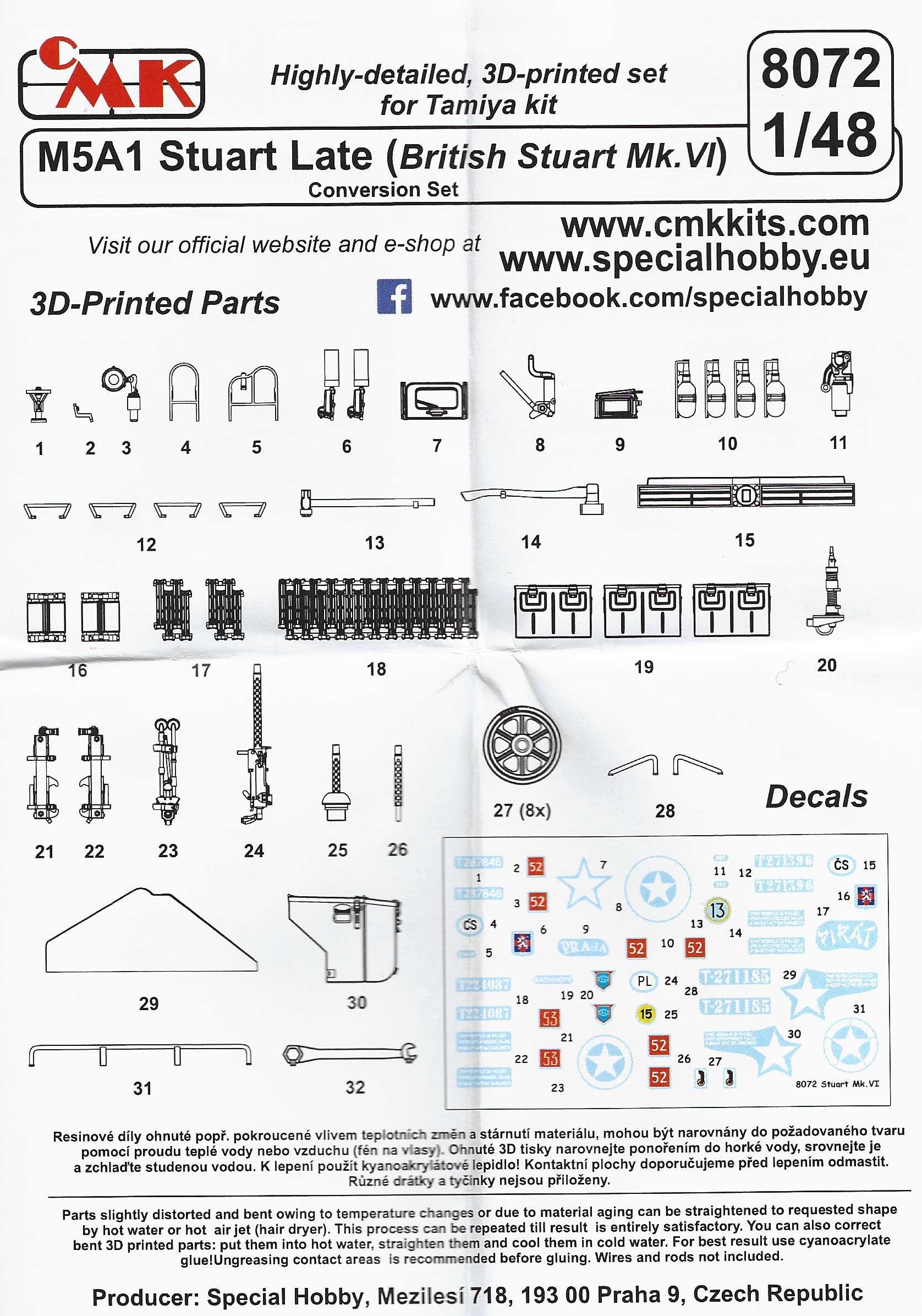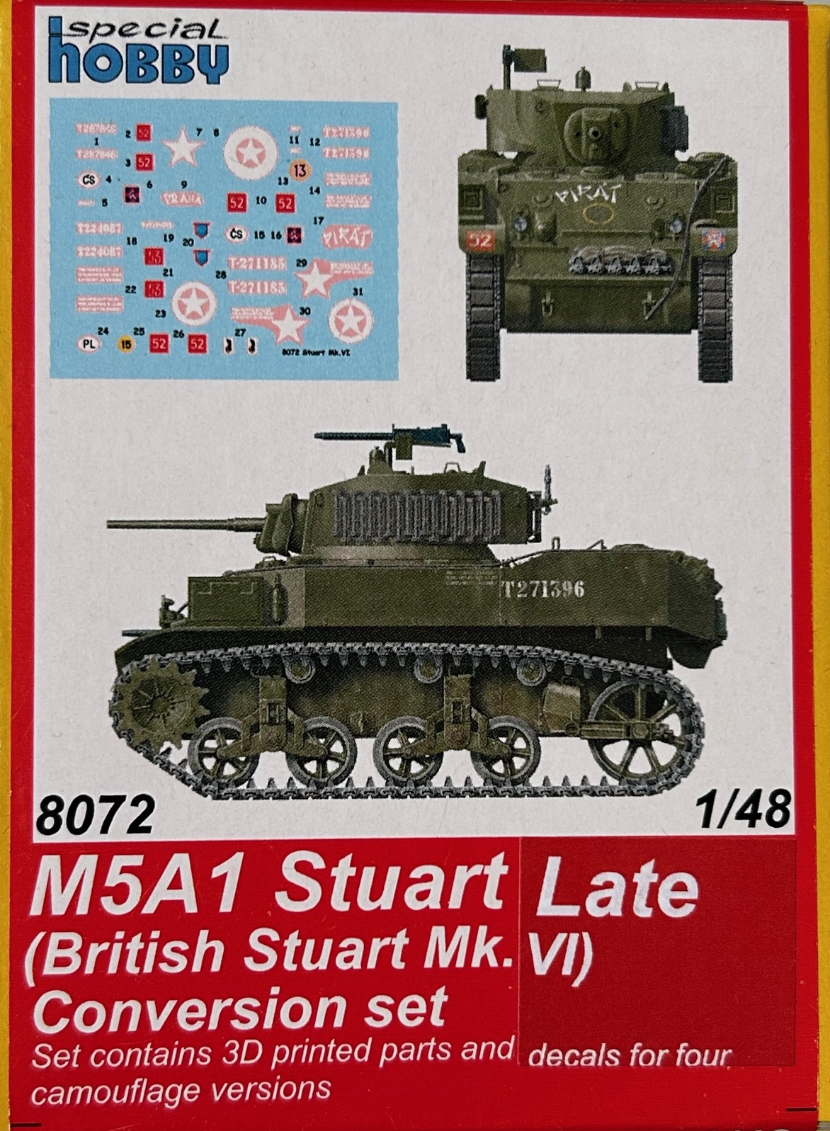 Das Update Set: Das Update Set: Passend für den Tamiya Bausatz des leichten amerikanischen Panzers M5A1 bietet die Firma Special Hobby zusammen mit CMK derzeit zwei Conversion Bausätze an, unter dessen Verwendung der leichte Panzer in die späte Version umgerüstet werden kann. Davon gibt es nun ein Set für eine amerikanische bzw. französische Ausführung oder als Alternative für den Bau eines Stuarts unter britischer Flagge.