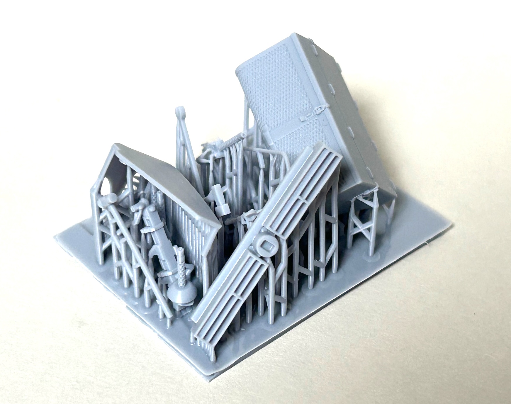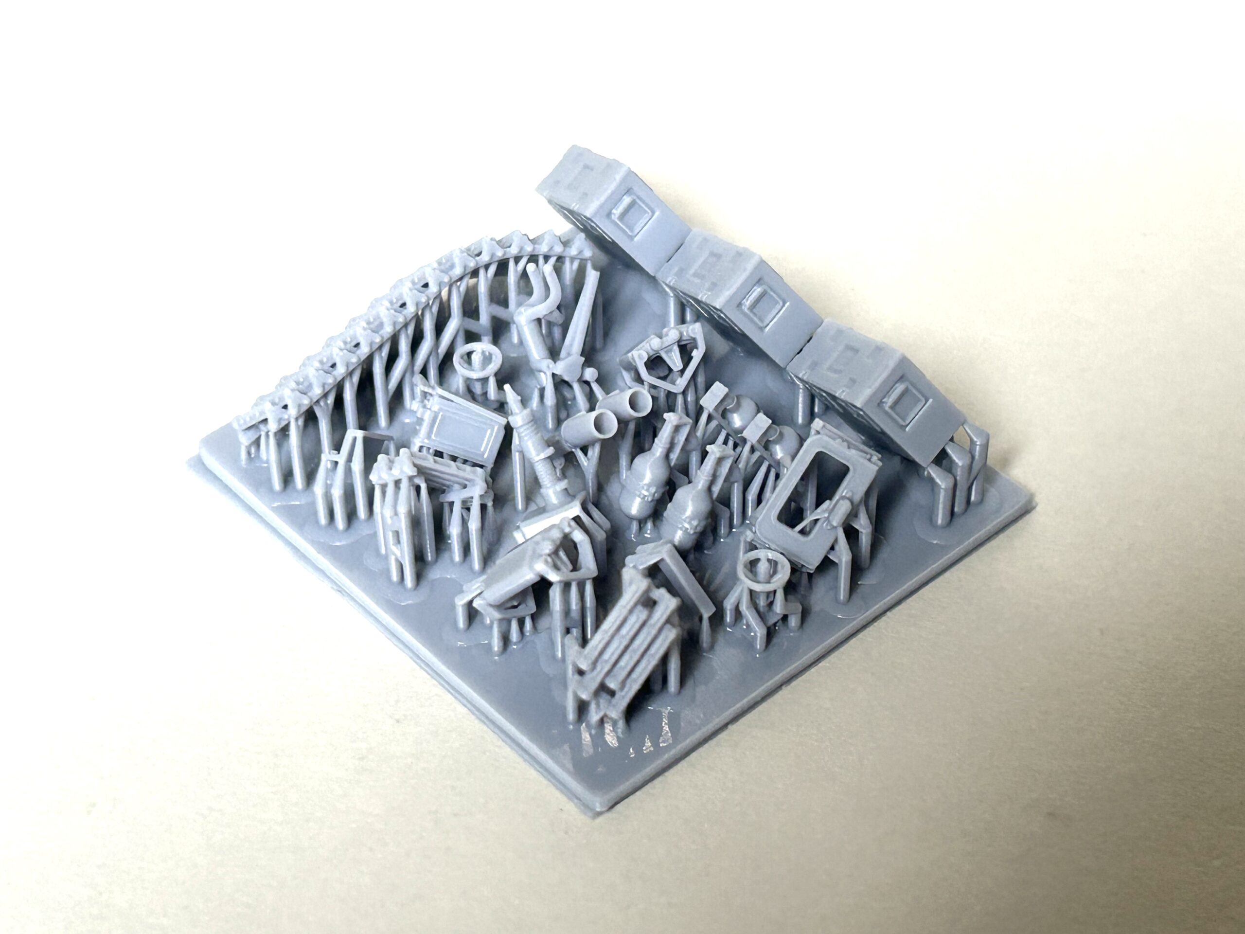 Das Set für die englische Version wird in einem kleinen Karton geliefert, der die im 3D Druckverfahren hergestellten Teile auf vier Druckplatten enthält. insgesamt handelt es sich um 32 verschiedene Teile, wobei die Laufräder 8-mal vorhanden sind. Was genau erhält man als Kunde damit aber für sein Geld? Zum einen perfekt gedruckte Teile, die auf den Tamiya Bausatz zugeschnitten sind und das eine oder andere Teil vom Plastik Bausatz als optimierte Alternative ersetzen. Dies gilt insbesondere für die Laufräder. Auch die Kettenglieder, die als zusätzliche Panzerung oft am Turm montiert waren und die Browning MGs inklusive Dreibein sind ein wahrer Augenschmaus. Gleiches gilt für die extrem feinen Schutzbügel der Scheinwerfer und die Periskope.