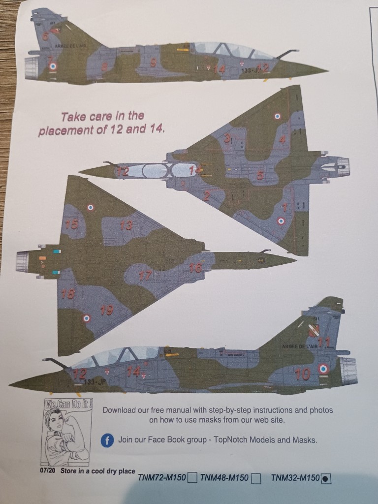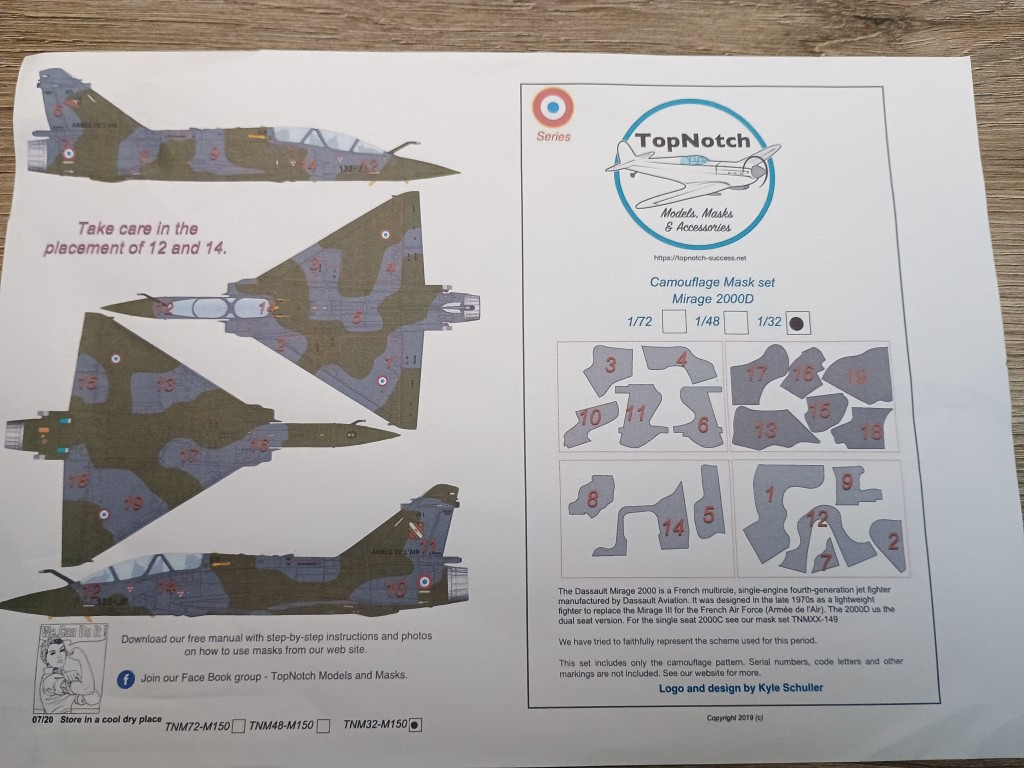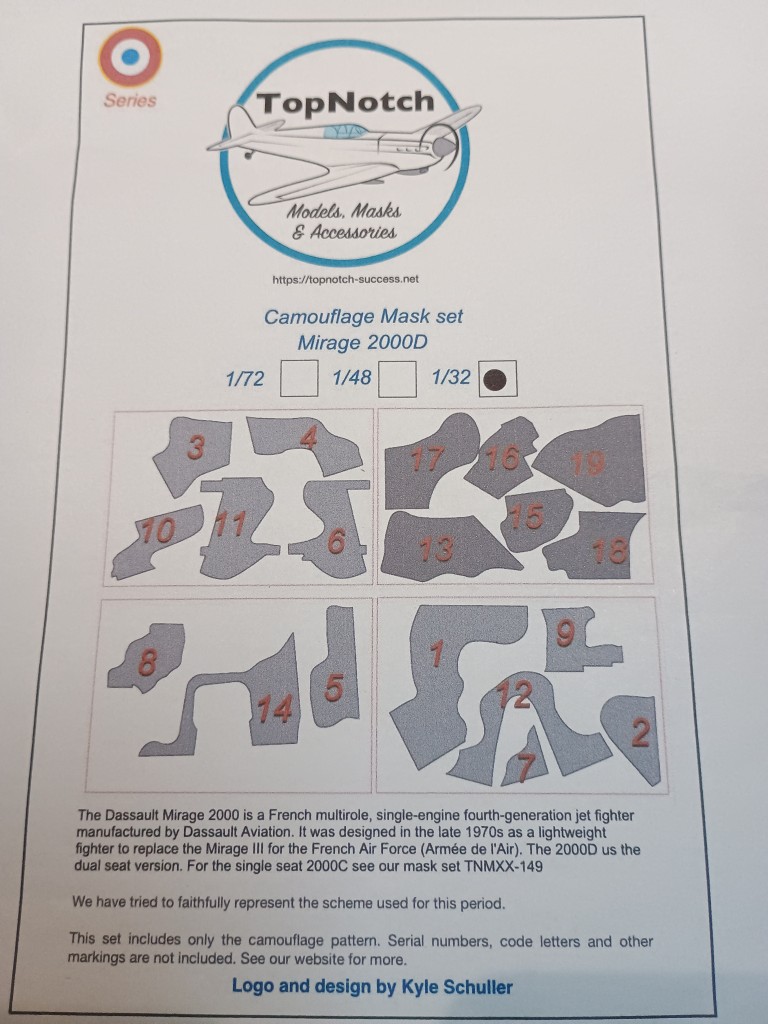 Die meisten asymmetrischen Tarnschemen lackiere ich frei Hand, ohne zu Maskieren. Ausnahmen bilden die Trennung von Ober-und Unterseite, wenn es kein Wrap Around ist oder Tarnung nach BW Norm 72 für Phantom oder Starfighter , die sind zwar asymmetrisch aber gradlinig. Weil ich im Moment aber eine Kitty Hawk Mirage 2000 D baue, habe ich ein bisschen Geld in die Hand genommen und mir die Maskierfolie von TopNotch gekauft.