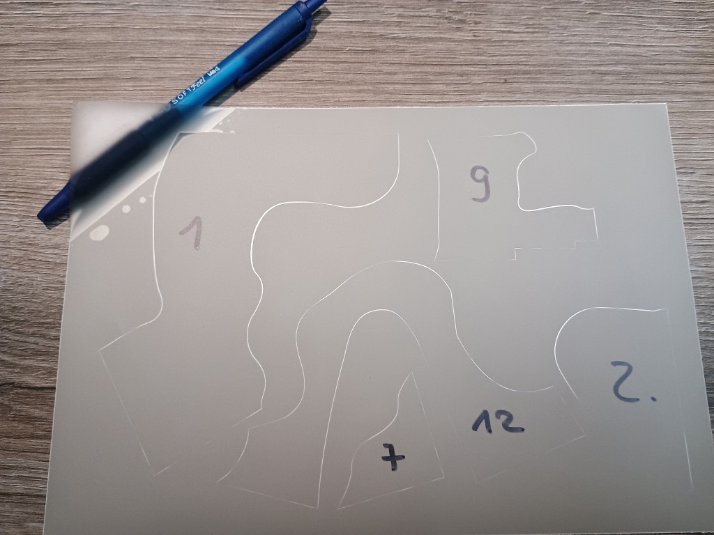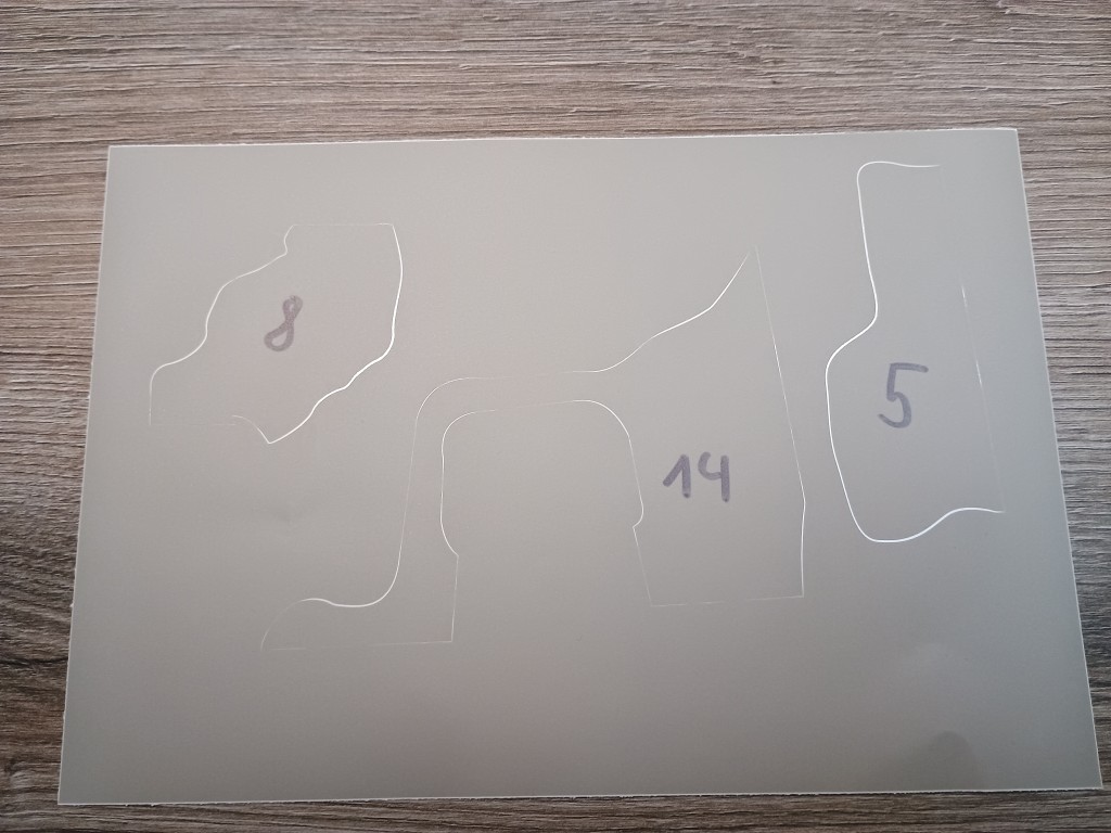 Die Anleitung ist selbsterklärend. Das Model muss zuerst in Grau lackiert werden. danach die Abschnitte der Folie drauf und mit Grün nachlackieren. Die Folie selbst scheint dünn genug um sich der Kontur des Models anzupassen. Es werden 4 Bögen mit den entsprechenden Segmenten geliefert. Anhand der dünnen weißen Linien kann man die Segmente auseinander halten. Ich habe sie trotzdem mit einem Permanentmarker beschriftet, so sollte es nicht zu Verwechselungen kommen. Die Folie sieht zwar grün aus, in Wirklichkeit ist aber grünlich-Durchsichtig.