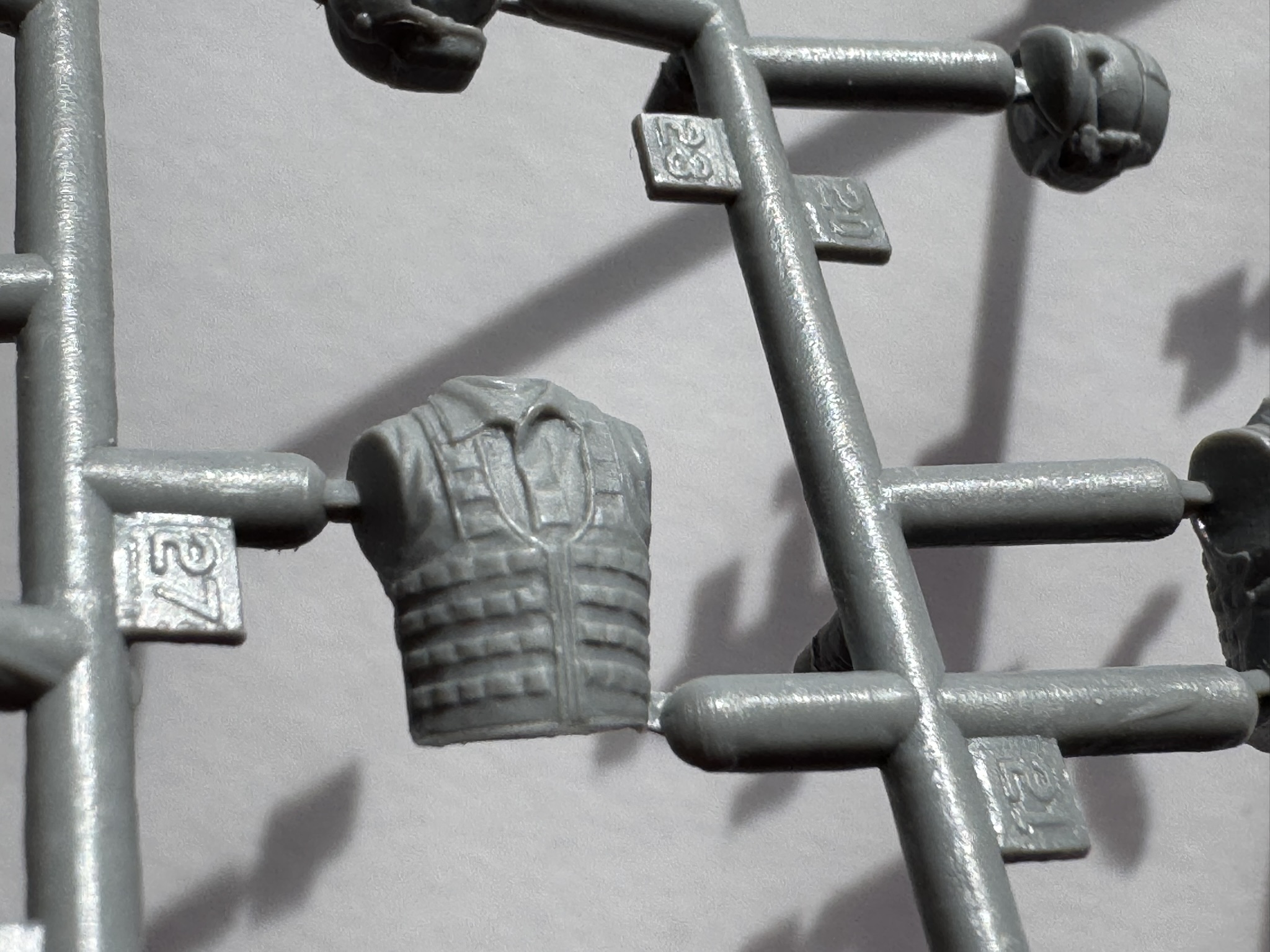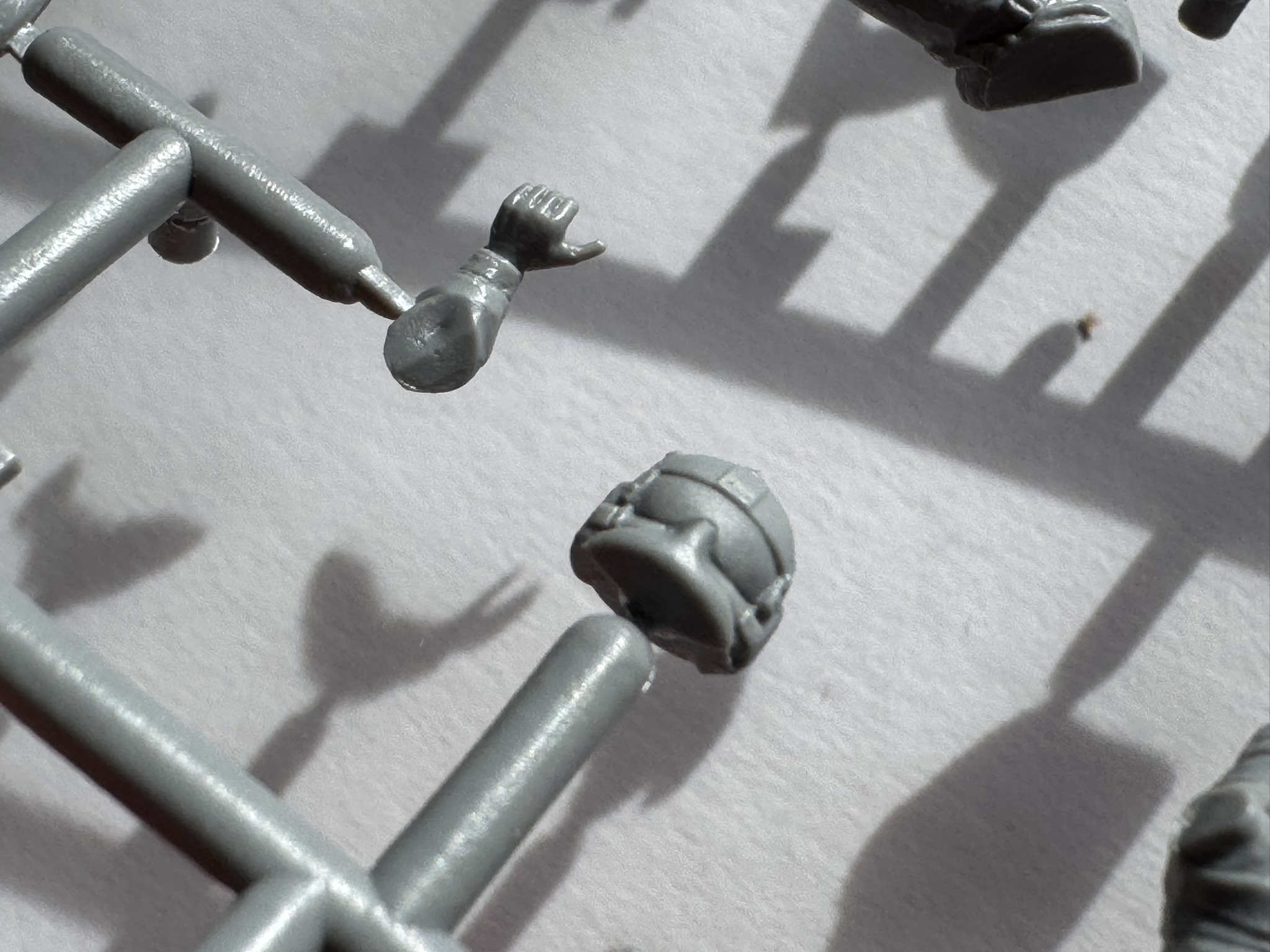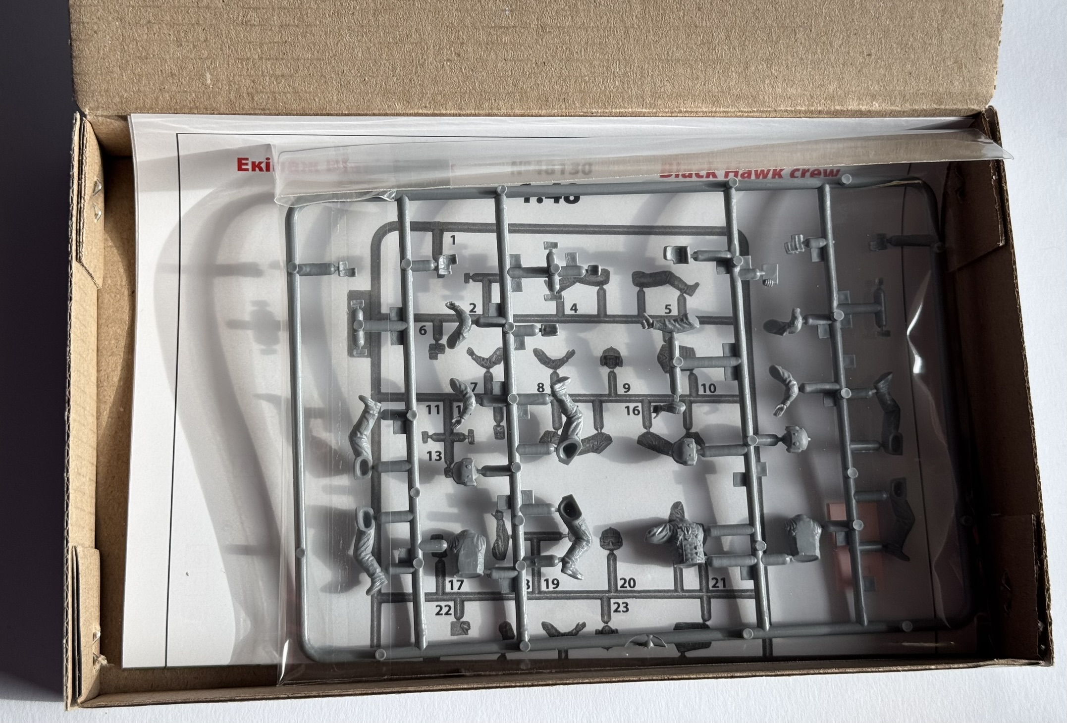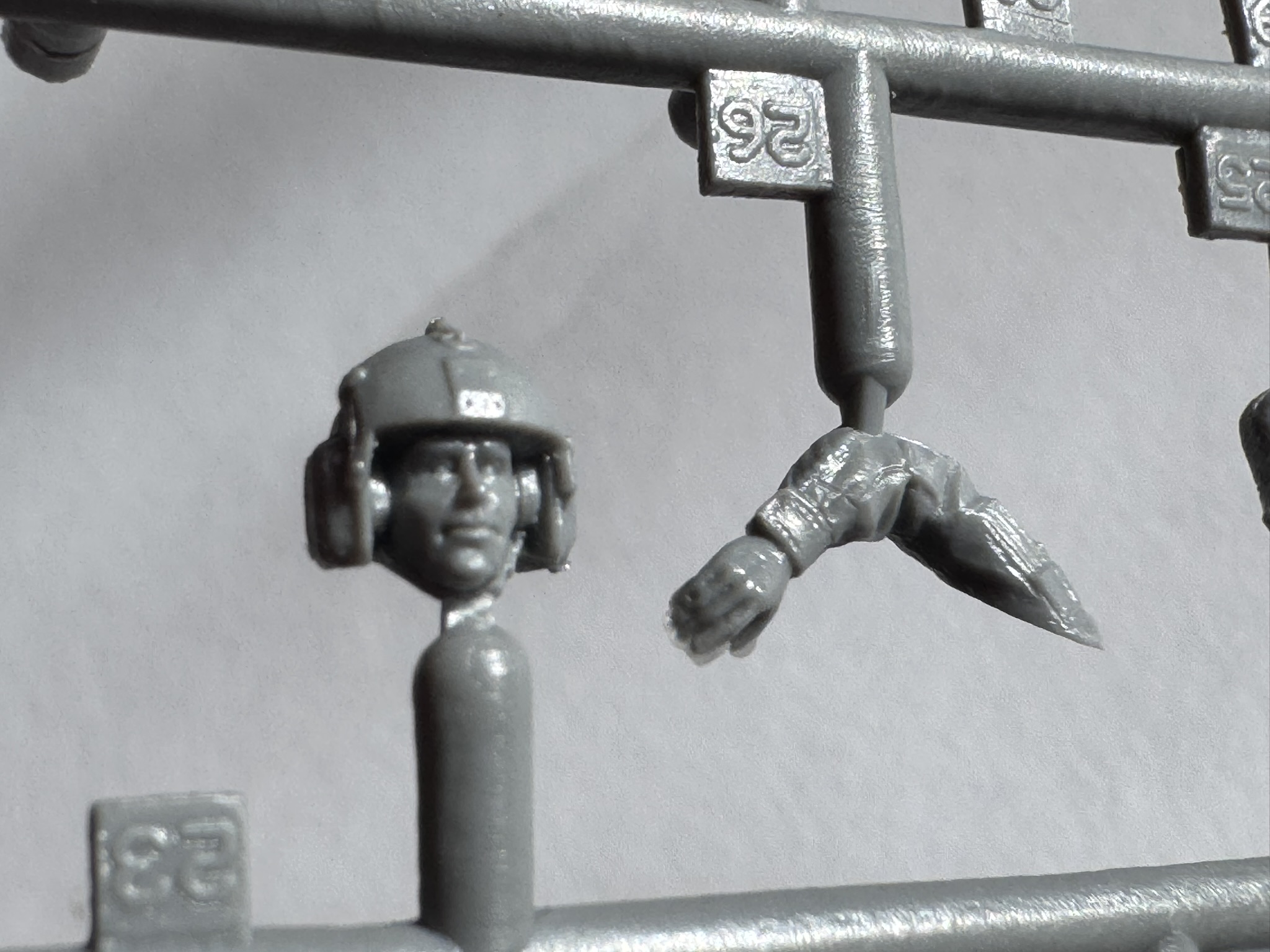 Alle drei Crewmitglieder finden auf einem einzigen Gussrahmen Platz. Für den Maßstab sind die Details völlig in Ordnung, an einigen Stellen gibt es etwas Fischhaut, aber das hält sich in Grenzen. Die Figur im Laderaum trägt den HGU-56P-Helm mit dem typischen Faceshield, um sich vor dem Wind zu schützen.