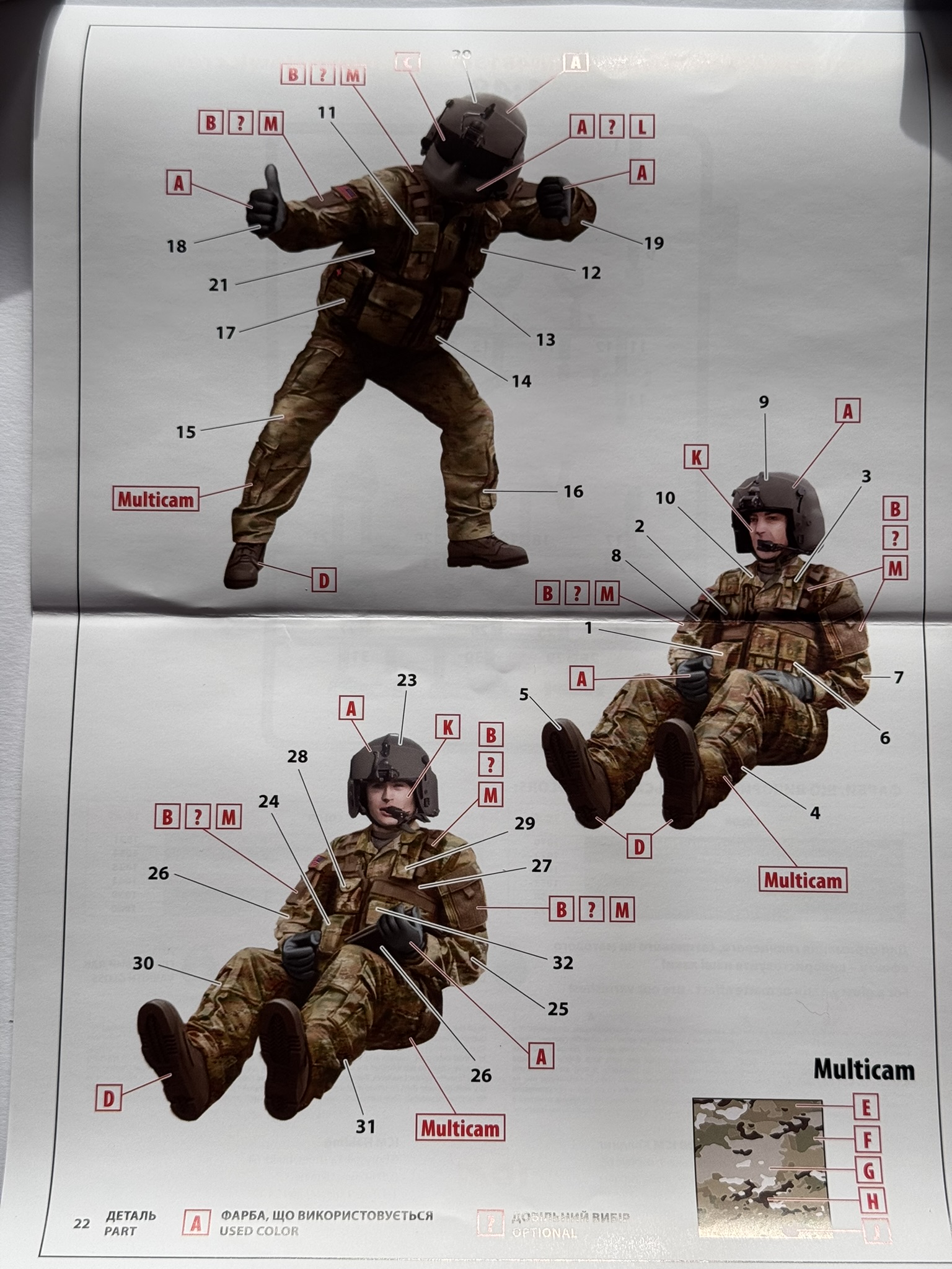 Anleitung: Diese Anleitung ist Bemalvorschlag und Bauanleitung in einem. Sie zeigt lediglich, welche Teile zu welcher Figur gehören und stellt die klassische Multicam-Tarnung der US Army dar. Diese von Hand zu bemalen, dürfte eine echte Herausforderung sein. Decals für Hoheitsabzeichen o. Ä. liegen dem Set nicht bei.