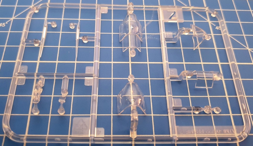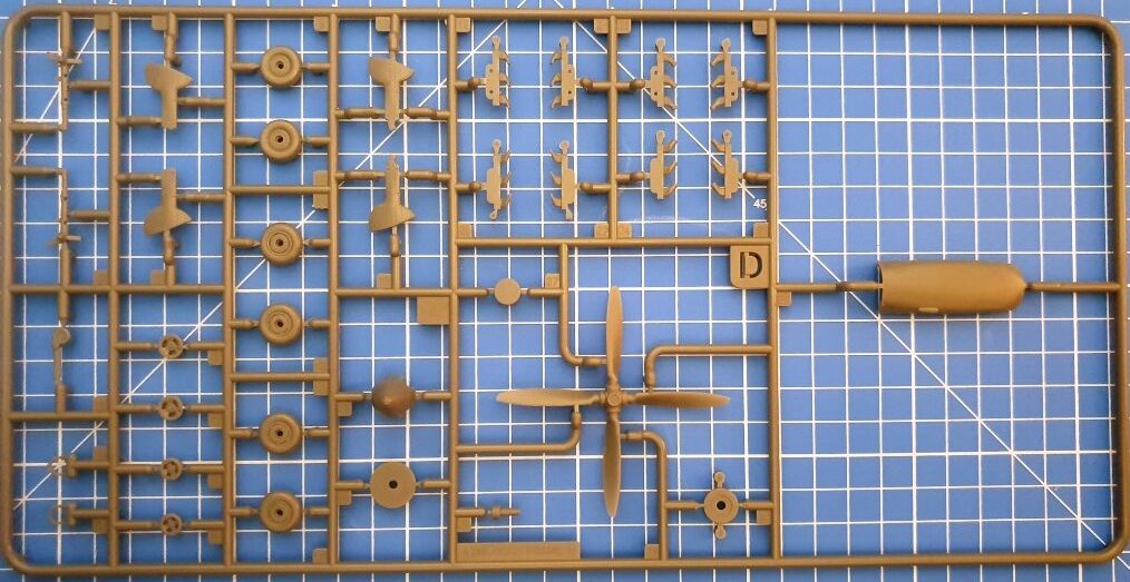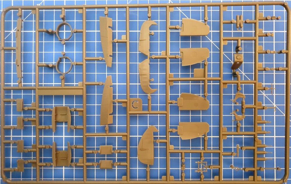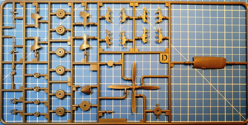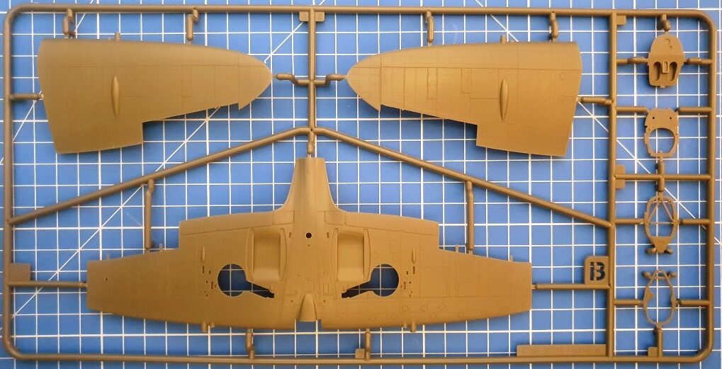 Positiv ist die Tatsache zu werten, dass die obere Motorhaube einteilig ausgeführt ist, was Schleifarbeiten erspart (erinnert sei hier nur an Eduards Mk. IX, für die man ein extra Resinteil für diesen Zweck erwerben muss). Wie heutzutage zu erwarten, sind alle Ruder separat und nach Geschmack zu positionieren, ebenso wie die Kühlerklappen. Drei Paar Räder sind entweder bei geschlossenem Fahrwerk direkt in den Fahrwerkschächten zu befestigen oder wahlweise mit Block- oder Radialprofil an das Fahrwerk zu montieren. Alle sind leicht abgeplattet. Das Spornrad ist, wie bei Spitfires Mk. IX typisch, nicht einfahrbar und daher nur schlicht anzukleben. Wer seinen Propeller drehbar halten möchte, kann ihn nach dem Schließen von vorn mit Rückhalteplatte und Retainer einsetzen, so wie es Revell schon in den Sechzigern bei seinen 1/72-Kits vorgemacht hat. Wie so was modern geht, lernt man besser bei Tamiya, die Ihre drehbaren Teile mit Weichplastik-Manschetten aufsteck- und abnehmbar halten. Die Auspufföffnungen sind leider nicht aufgebohrt, es gibt runde und Fishtail-Rohre. Für die Cockpithaube liegen für die geöffnete Version eine separate Haube und ein hinteres Klarteil vor, für den geschlossenen Zustand gibt es ein Kombiteil, nach deren Anbringung der Bau bereits beendet ist.