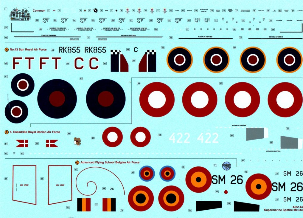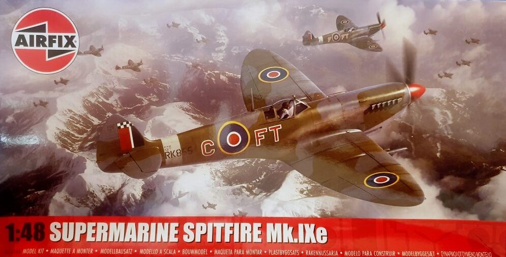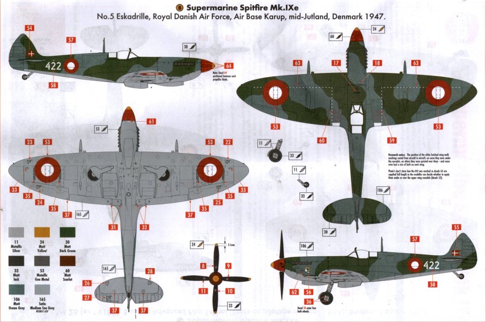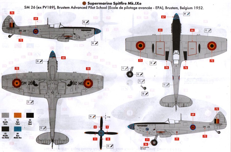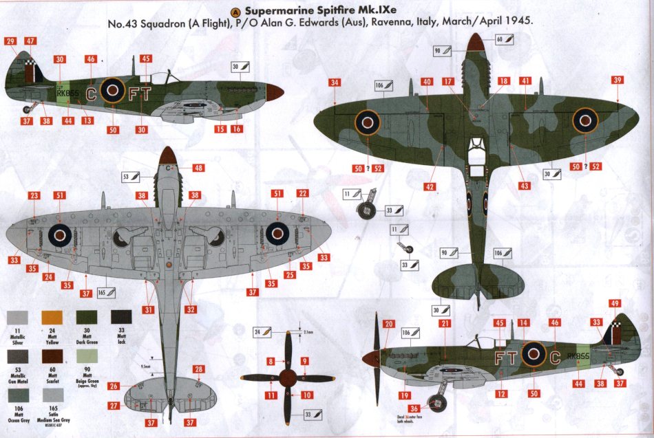 Geschichte: Die Spitfire Mk. IX wurde ab der zweiten Jahreshälfte 1944 mit amerikanischen 12,7-mm-Colt-Browning-Maschinen-Gewehren an den Flügeln ausgerüstet. Die Tragflächen waren ansonsten konstruktiv identisch mit denen der Spitfire Mk. IXc, wobei die äußeren MG-Halterungen beibehalten wurden und gleichzeitig die 7,7-mm-Brownings entfernt wurden. Die großkalibrige 12,7-mm-Browning wurde innenbords der 20mm-Hispano-Maschinenkanone angeordnet, die nun selbst außen an den Flügeln befestigt wurden. Diese Version wurde als Mk. IXe bezeichnet. (Quelle: Bauanleitung)