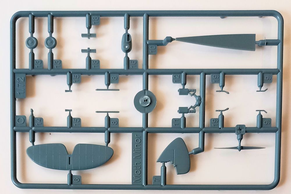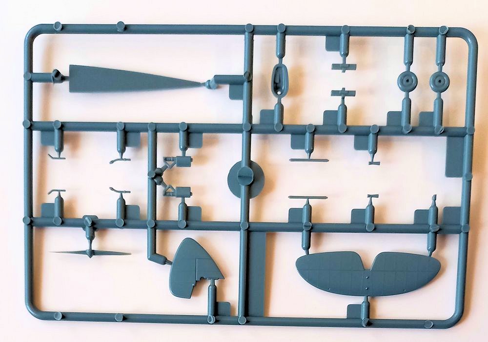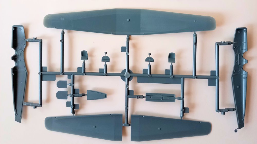 Die Teile sind sauber abgespritzt und machen einen sehr guten Eindruck. Es gibt bei den Bauteilen eine Mischung aus versenkten und erhabenen Gravuren, was sich aber nicht negativ darstellt. Die Rumpfinnenseiten weisen im Cockpitbereich erhabene Strukturen auf. Die beiden Armaturenbretter sind glatt ausgeführt. Dafür gibt es aber zwei Abziehbilder. Die Sitze werden durch je zwei Gurtabziehbilder aufgewertet. Die durchgehende untere Tragflächenhälfte gibt den richtigen Einbauwinkel vor.