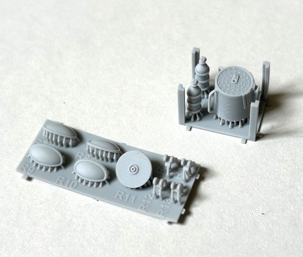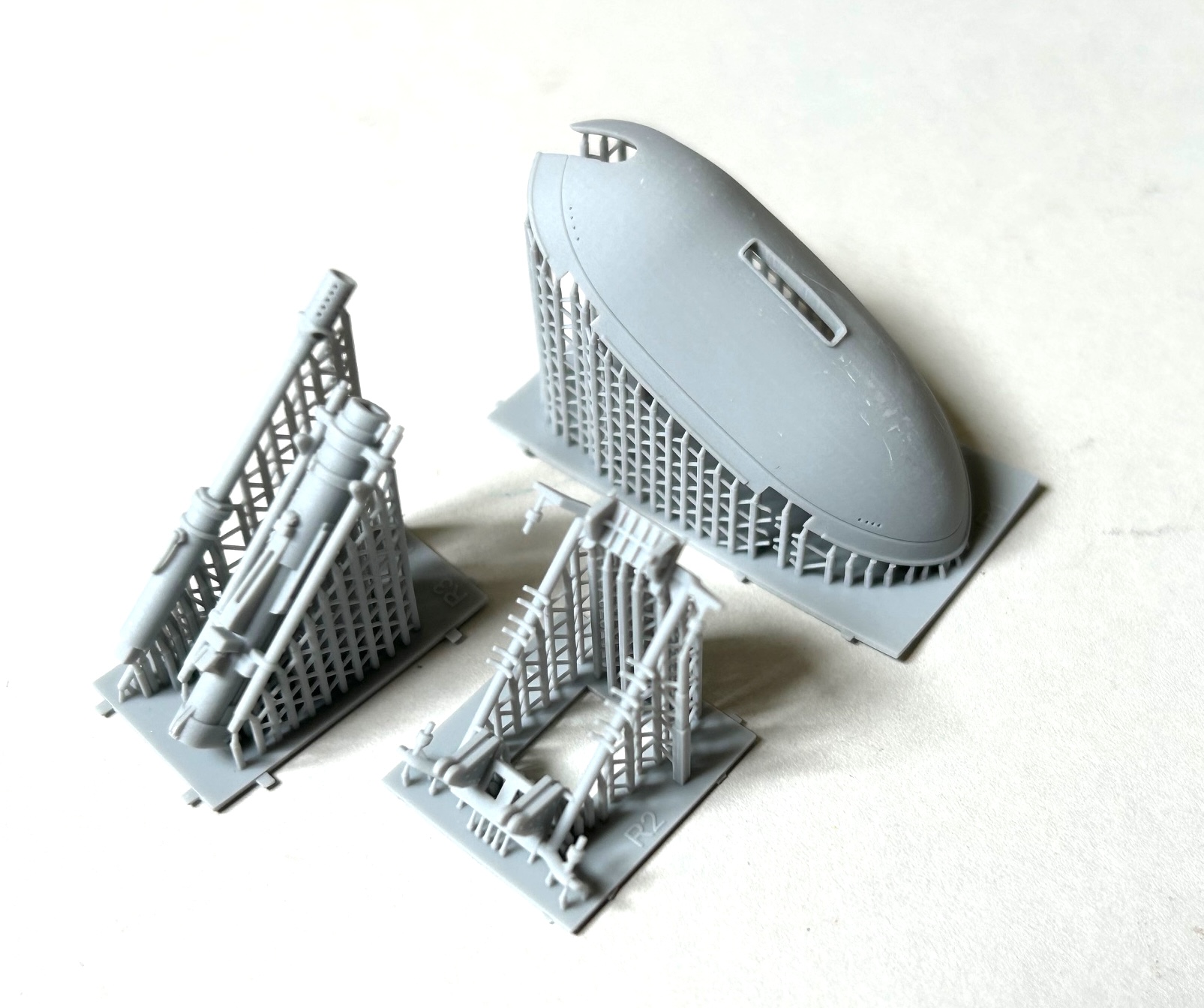 In der typischen stabilen Klappbox findet man 15 im 3D Druckverfahren perfekt hergestellte Teile. Neben der zweiteiligen Maschinenkanone liegen die Waffenabdeckung mit separaten Scharnieren und deren Abdeckungen sowie die Munitionstrommel, die Gasdruckbehälter und ein extrem filigraner Rahmen mit feinsten Details für die Waffenaufhängung bei.