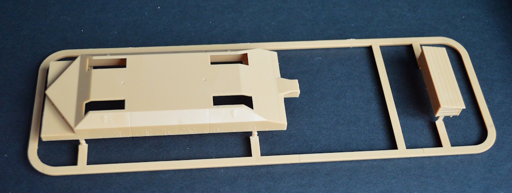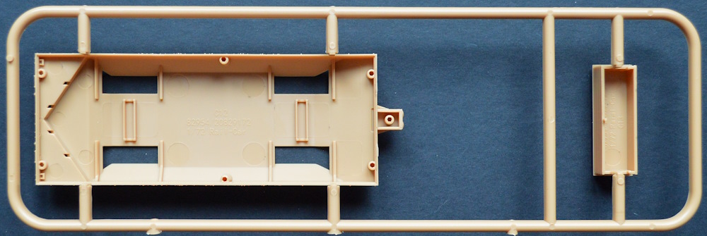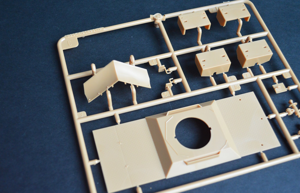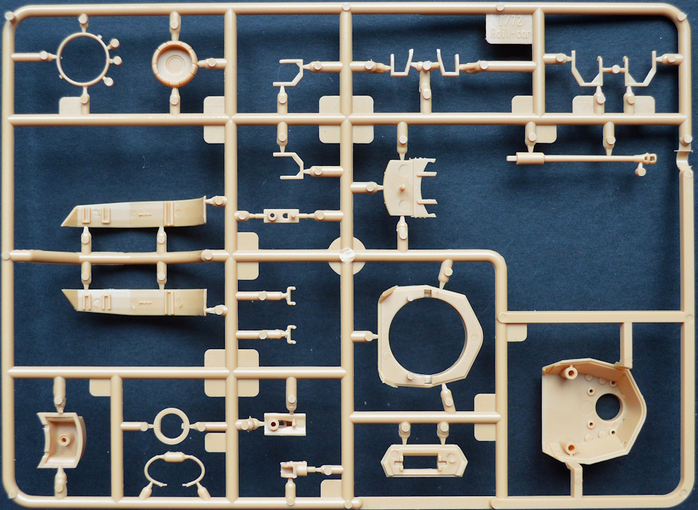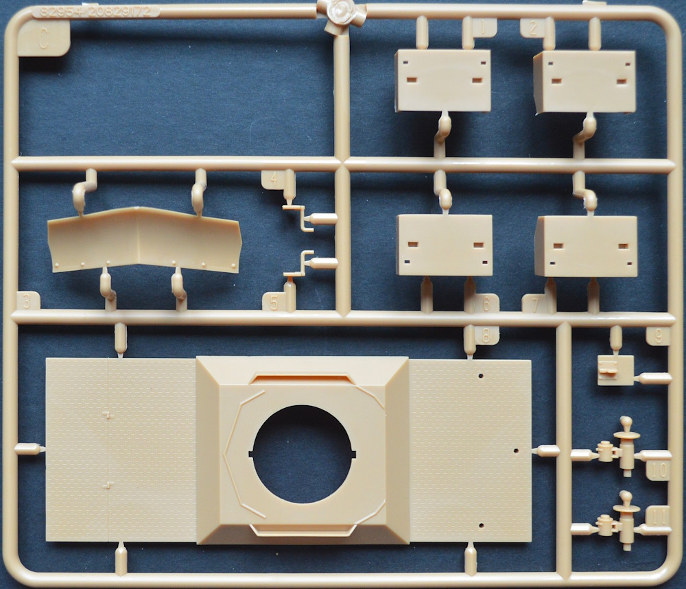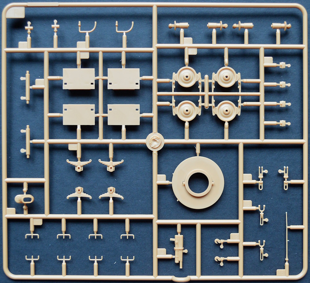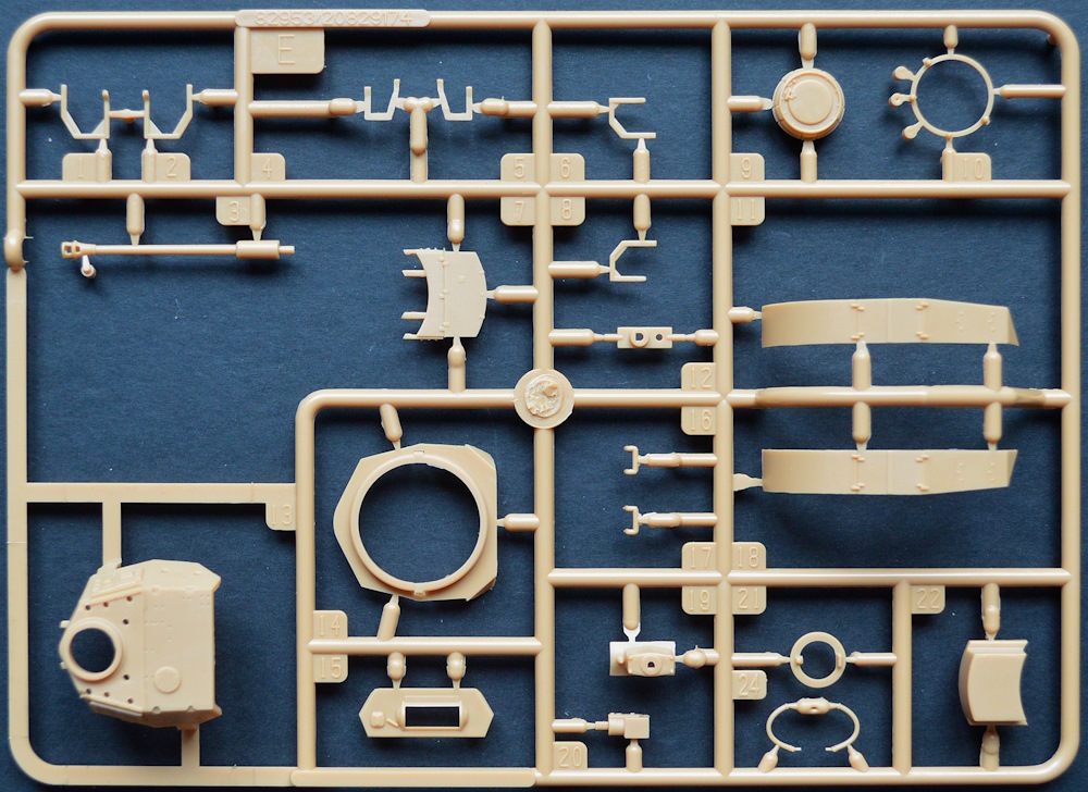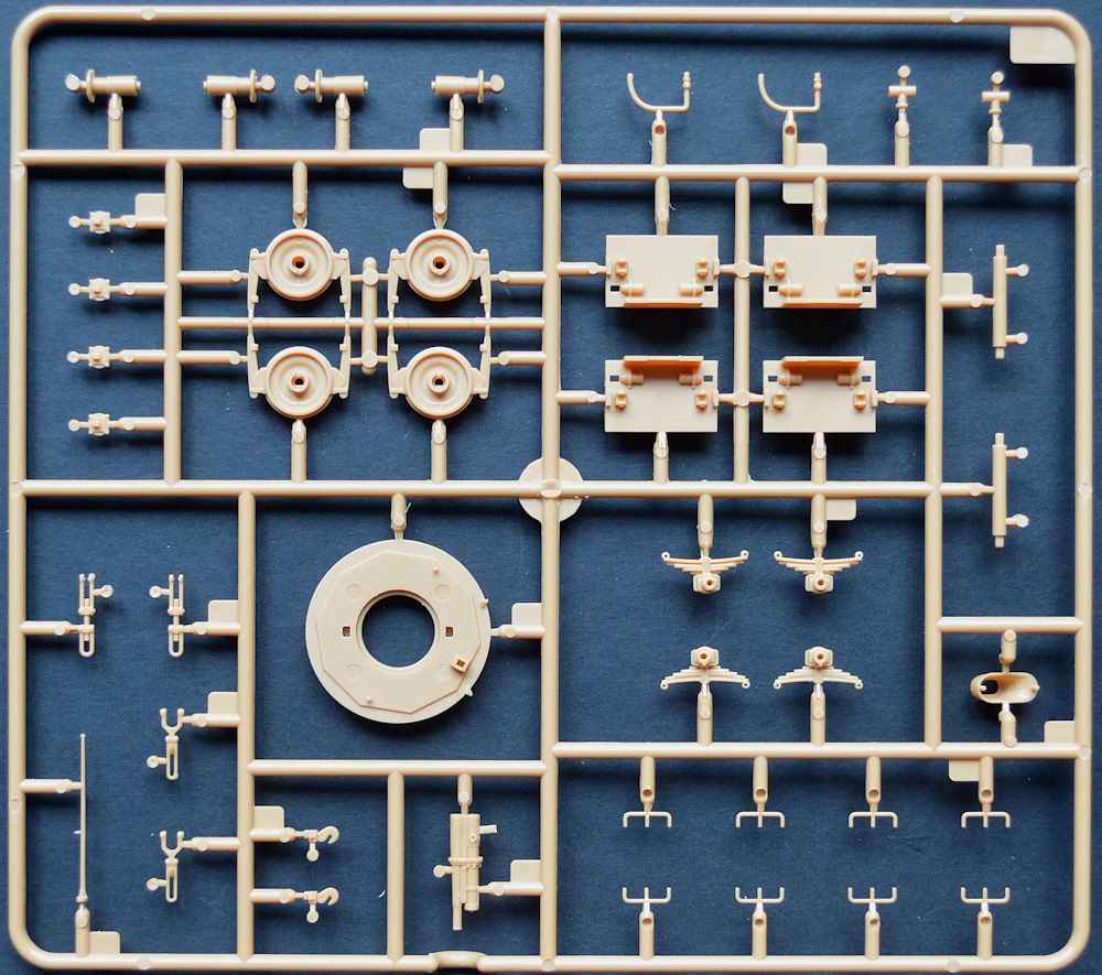 Der große und stabile Stülpkarton ist attraktiv gestaltet. Er enthält sechs braune Spritzgussrahmen, einen Decalbogen sowie die Bau- und Bemalungsanleitungen. Die Rahmen sind in Folien verpackt, wobei ein Rahmen mit fragileren Teilen zusätzlich durch Schaumstoff geschützt wird. Die Gussqualität fällt gut aus: die Auswerfermarkierungen befinden sich in später nicht einsehbaren Bereichen. Sinkstellen erkenne ich keine. Formtrennstellen und Flash halten sich in Grenzen, sodass das Versäubern später nicht allzu viel Zeit einnehmen sollte. Die Detaillierung fällt solide aus: Viele Teile sind etwas kräftiger ausgeführt, als es die heutige Spritzgusstechnik zulassen würde. Dadurch entsteht ein robuster, stellenweise leicht klobiger Eindruck. Im Gegensatz zum großen Bruder von Trumpeter wurden leider keine Ätzteile beigelegt, wodurch Bauteile wie die Seitenschürzen und deren Aufhängungen maßstäblich zu dick wirken.