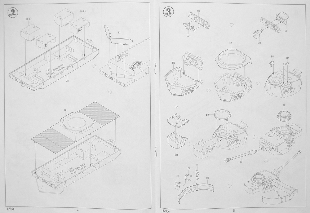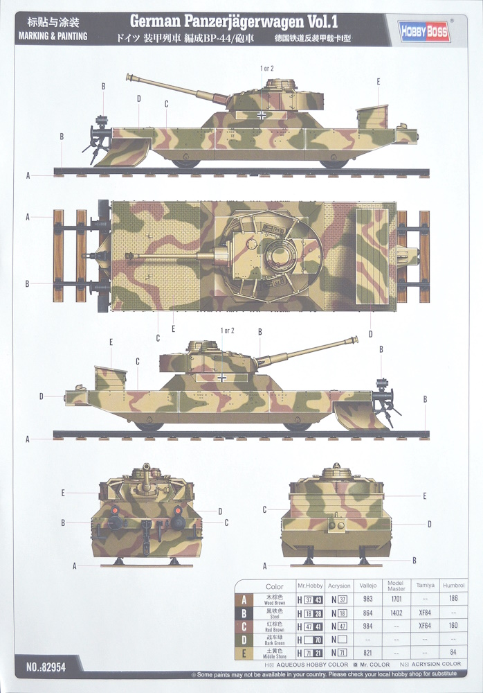 Die schwarz-weiße Bauanleitung ist übersichtlich gestaltet und führt in nur wenigen (Teil-)Schritten zum fertigen Modell. Auf Besonderheiten bei der Montage sowie nicht zu verklebende oder zu entfernende Teile wird genügend eingegangen. Leider liegt dem Bausatz nur eine nicht näher beschriebene Bemalungsoption bei. Als Farben werden Mr. Hobby (Gunze), Acryvision, Vallejo, Model Master, Tamiya und Humbrol angegeben. Allerdings wird nicht zu jedem System immer eine Farbnummer benannt. Die wenigen Decals enthalten lediglich Balkenkreuze. Eine Reihe von Markierungen, anhand derer sich auch der Panzerzug ableiten lässt, fehlt gänzlich. Die Decals sind sauber und versatzfrei gedruckt, weisen aber einen breit überstehenden Decalfilm auf, den man vor dem Auftragen sauber abschneiden sollte.