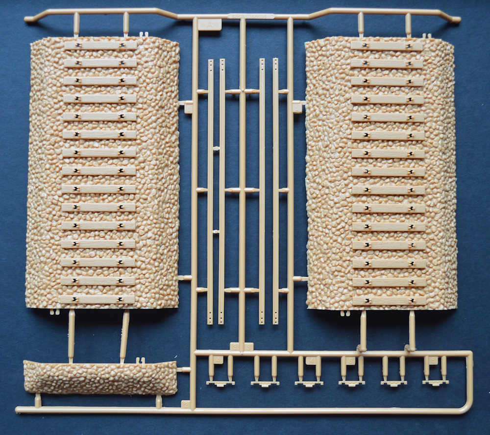 Dem Bausatz liegen zwei Abschnitte mit Gleisbett und Schienen bei, wobei diese mit anderen Sets verlängert werden oder durch die beiliegenden „Kanten“ abgeschlossen werden können. Auch ist die Darstellung von nur einem Abschnitt möglich, je nach gewünschter Länge der Präsentationsfläche. Das Gleisbett ist sehr grob gestaltet und fällt zu den Seiten relativ steil ab. Hier kann der Modellbauer leicht kleinere Steine und Schotter ergänzen, um ein filigraneres Bild zu erzeugen.