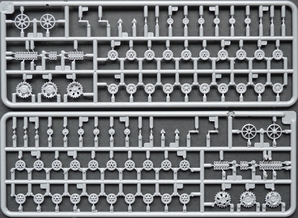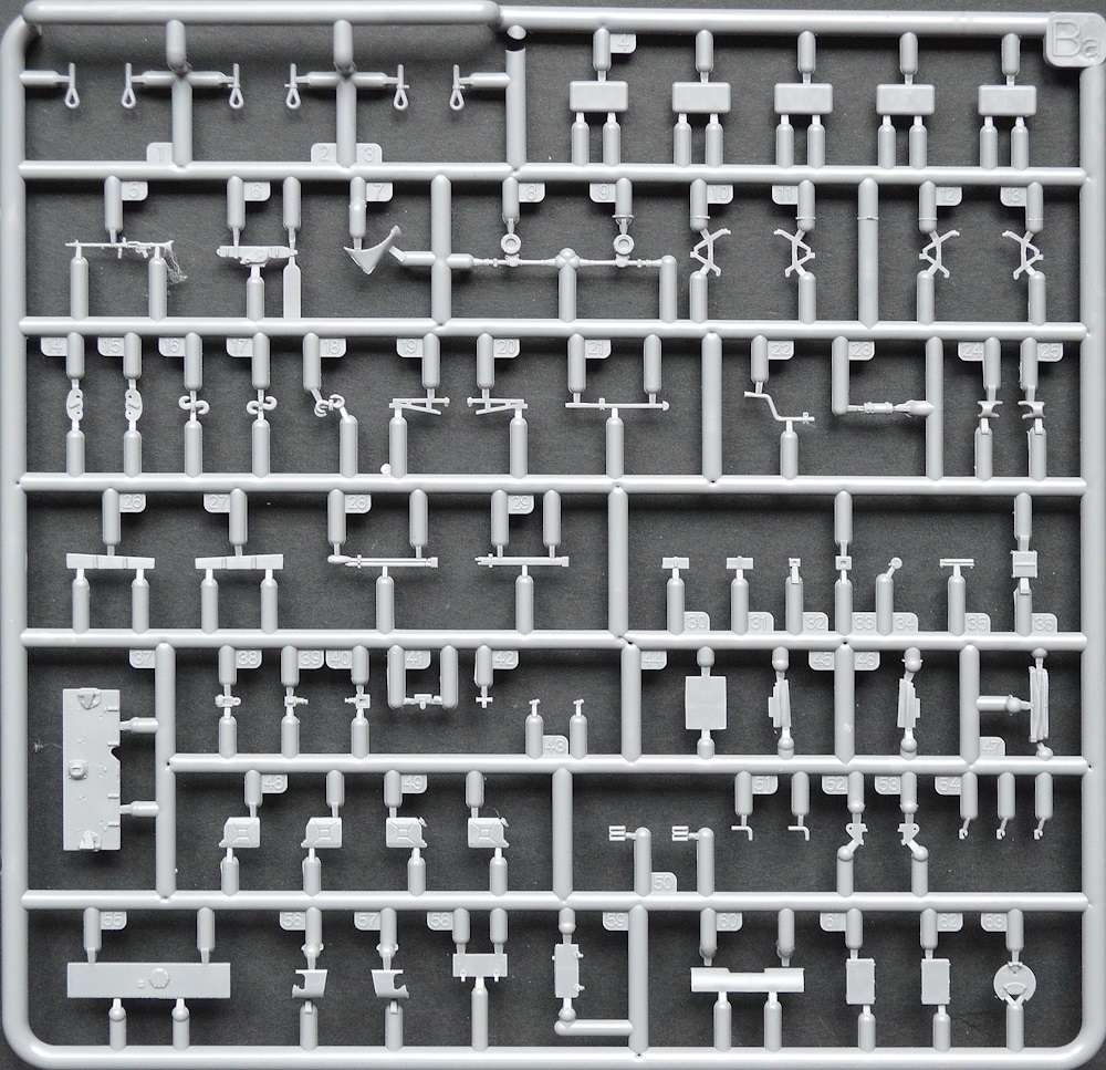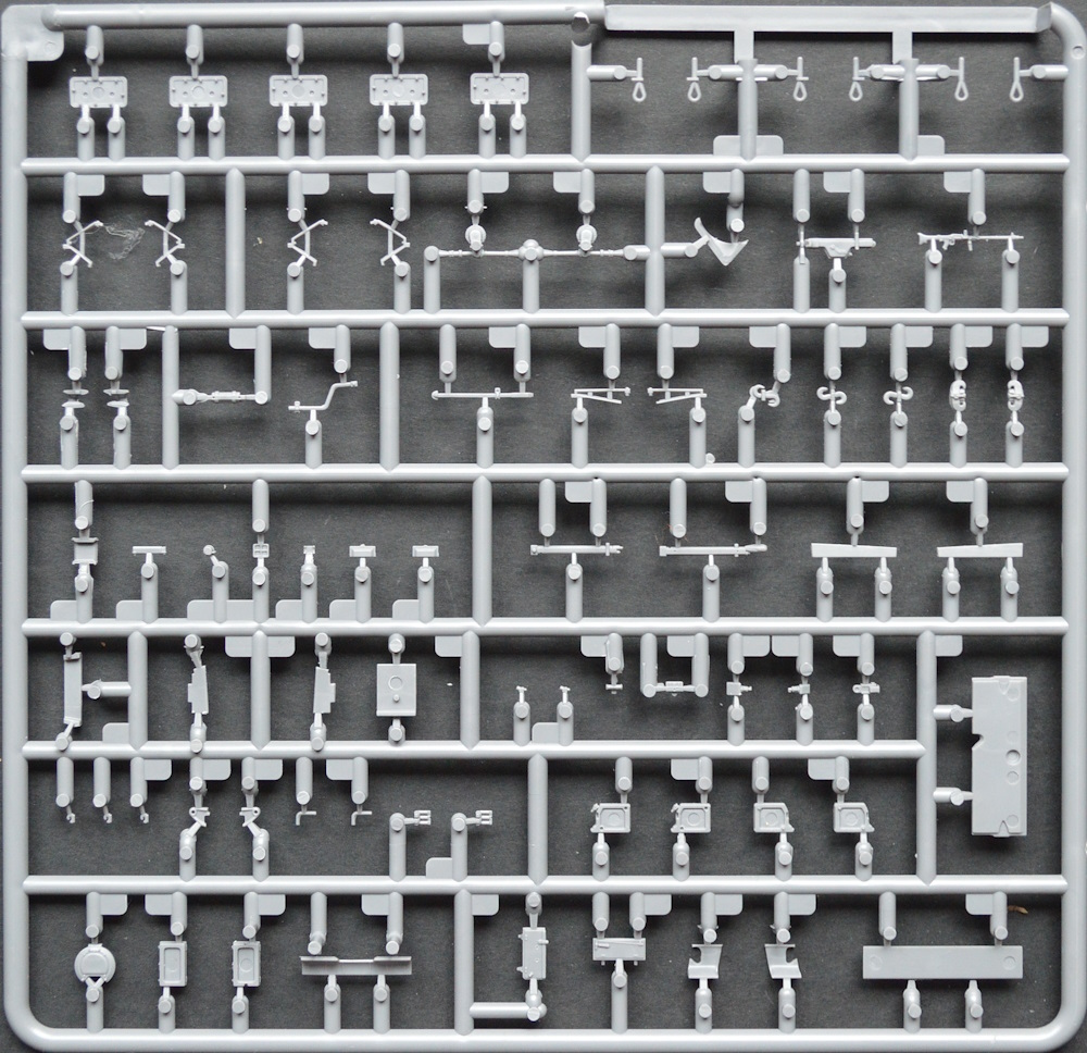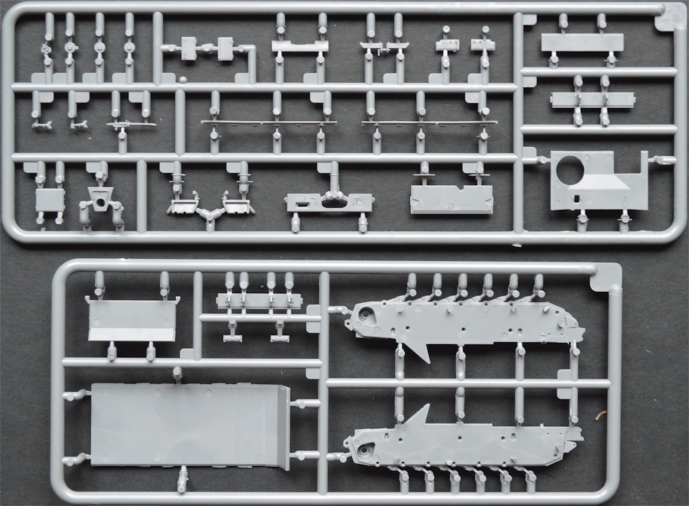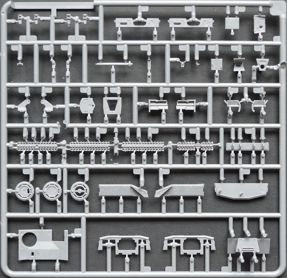 In dem anspruchsvoll gestalteten Stülpkarton befinden sich 13(!) graue und ein klarer Spitzgussrahmen, ein Fotoätzteilbogen, ein Decalbogen sowie die Bau- und Bemalungsanleitung. Die Qualität der Spritzgussteile fällt sehr gut aus. Einige Teile wie z. B. die Werkzeuge oder Speichen der Leiträder sind sehr fein ausgeführt, sodass hier kein Ersatz durch Zubehörteile notwendig wird. Auch sind die Details sehr scharf wiedergegeben und wirken nicht verwaschen. Sinkstellen habe ich keine entdeckt. Lediglich Fischhäute/Flash findet sich an mehreren Teilen. Es wurden Slidemolds verwendet, wodurch sämtliche Kanonenrohre oder auch die Ösen für Abschleppseile geöffnet dargestellt sind. Da Bauteile anderer Ausführungen oder Baulose mit beiliegen, wandern eine Menge gut detaillierter Teile in die Restekiste und können so den einen oder anderen Bausatz im Regal noch aufwerten.