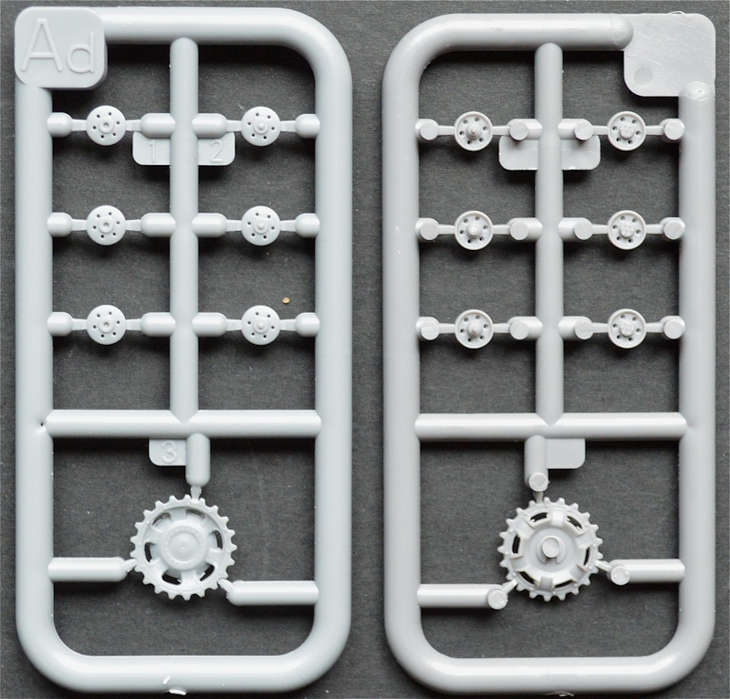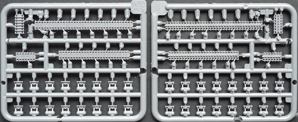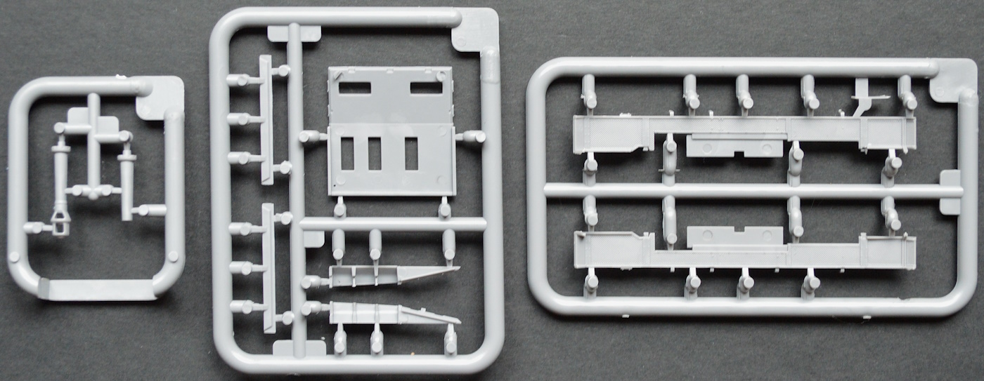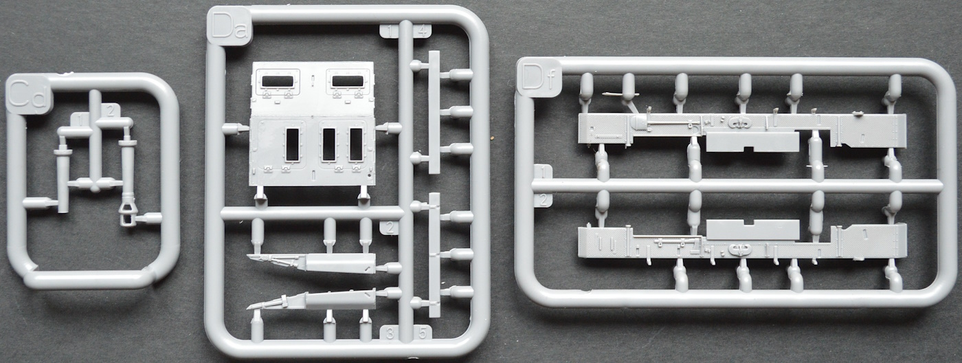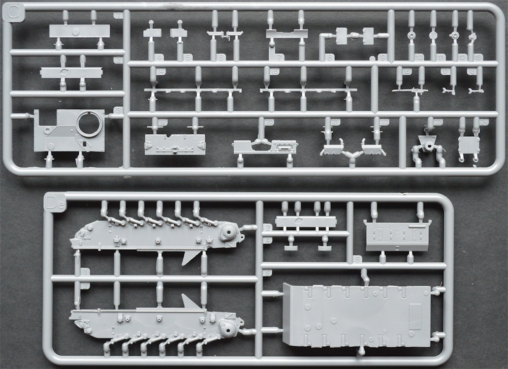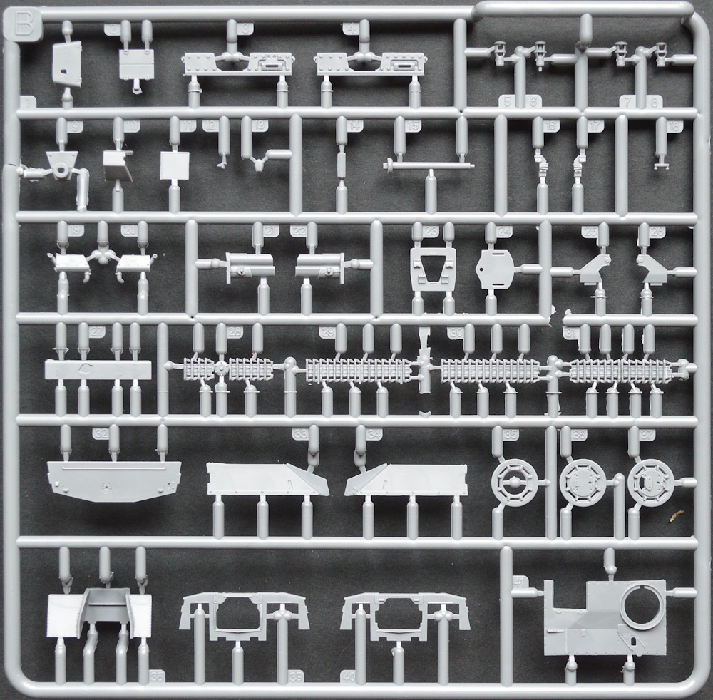 In dem anspruchsvoll gestalteten Stülpkarton befinden sich 13(!) graue und ein klarer Spitzgussrahmen, ein Fotoätzteilbogen, ein Decalbogen sowie die Bau- und Bemalungsanleitung. Die Qualität der Spritzgussteile fällt sehr gut aus. Einige Teile wie z. B. die Werkzeuge oder Speichen der Leiträder sind sehr fein ausgeführt, sodass hier kein Ersatz durch Zubehörteile notwendig wird. Auch sind die Details sehr scharf wiedergegeben und wirken nicht verwaschen. Sinkstellen habe ich keine entdeckt. Lediglich Fischhäute/Flash findet sich an mehreren Teilen. Es wurden Slidemolds verwendet, wodurch sämtliche Kanonenrohre oder auch die Ösen für Abschleppseile geöffnet dargestellt sind. Da Bauteile anderer Ausführungen oder Baulose mit beiliegen, wandern eine Menge gut detaillierter Teile in die Restekiste und können so den einen oder anderen Bausatz im Regal noch aufwerten.