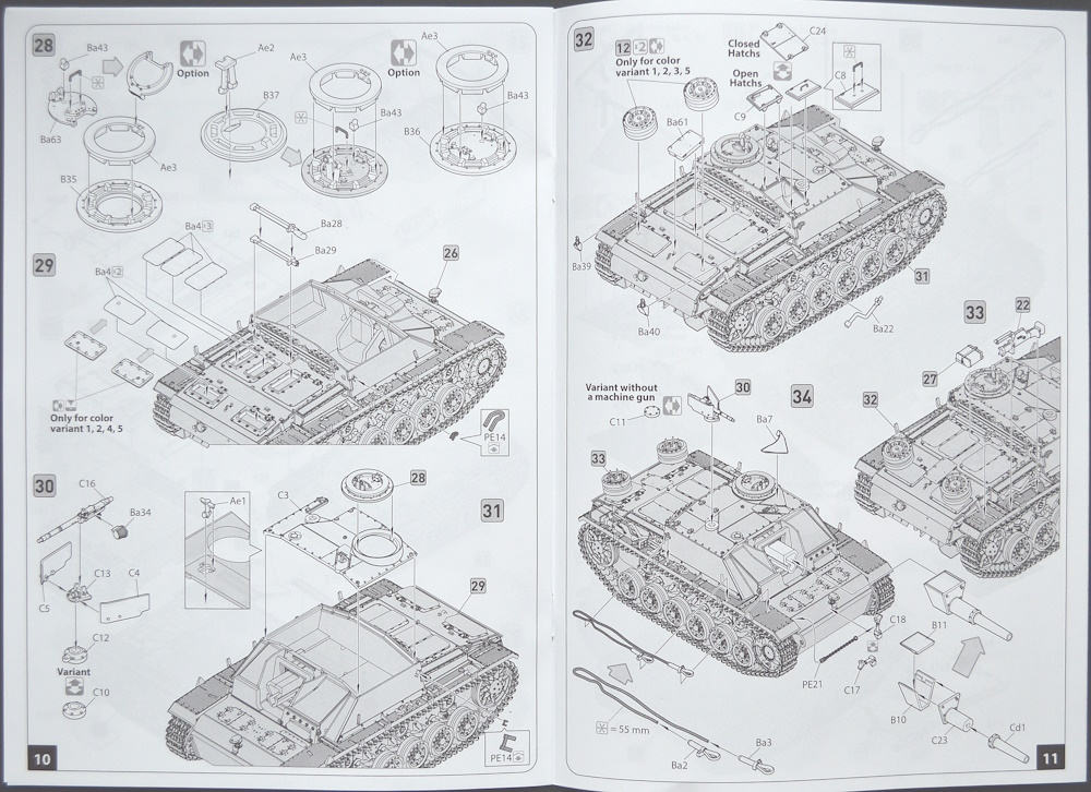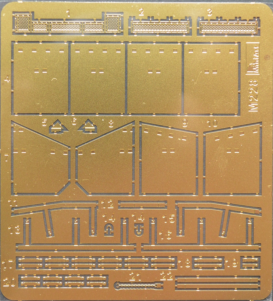Die Oberwannenseite fällt nicht weniger komplex und detailliert aus. Die Kasematte wird aus mehreren Teilen zusammengebaut, wobei die Geschützblende beweglich bleiben kann. Der Detailgrad ist größtenteils vorbildlich: der Wagenheber etwa besteht aus 4, und der Holzblock aus 3 Teilen. Dadurch bleiben sie auf allen Seiten detailliert. Schade, dass dagegen auf den Fendern und hinteren Seiten die Werkzeuge angegossen sind. Die Kommandanten- und Ladeschützenluken können geöffnet oder geschlossen dargestellt werden, beim Fahrer und Funker bleiben sie leider verschlossen. Sehr schön ist, dass die Winkelspiegel aus Klarsichtmaterial gegossen wurden. Einige Teile werden optional angeboten, so etwa die Ersatzlaufrollen auf dem Top Deck oder das fernbedienbare MG. Die Griffe, Abschleppseile und Stabantennen sollen selber hergestellt werden, wobei die Länge der Kabel und Antennen angegeben ist. Hierfür empfiehlt sich natürlich Draht und bei den Antennen konische Insektennadeln. Einiges an Geschick und Erfahrung wird bei den Seitenschürzen und den Rahmen auf dem Top Deck benötigt. Diese werden nämlich von MiniArt aus Ätzteilen angeboten, was hier ebenfalls der Detaillierung zu Gute kommt.
