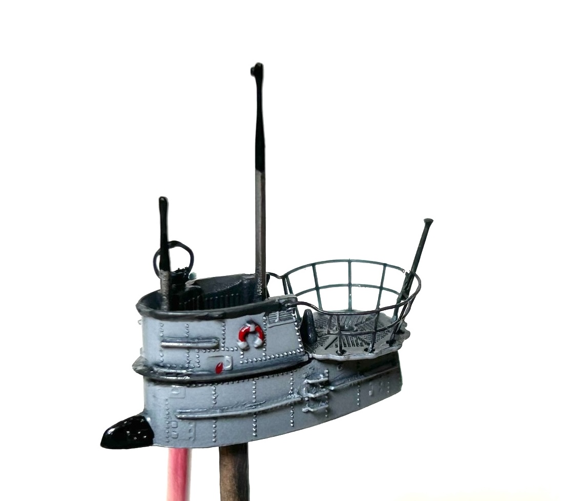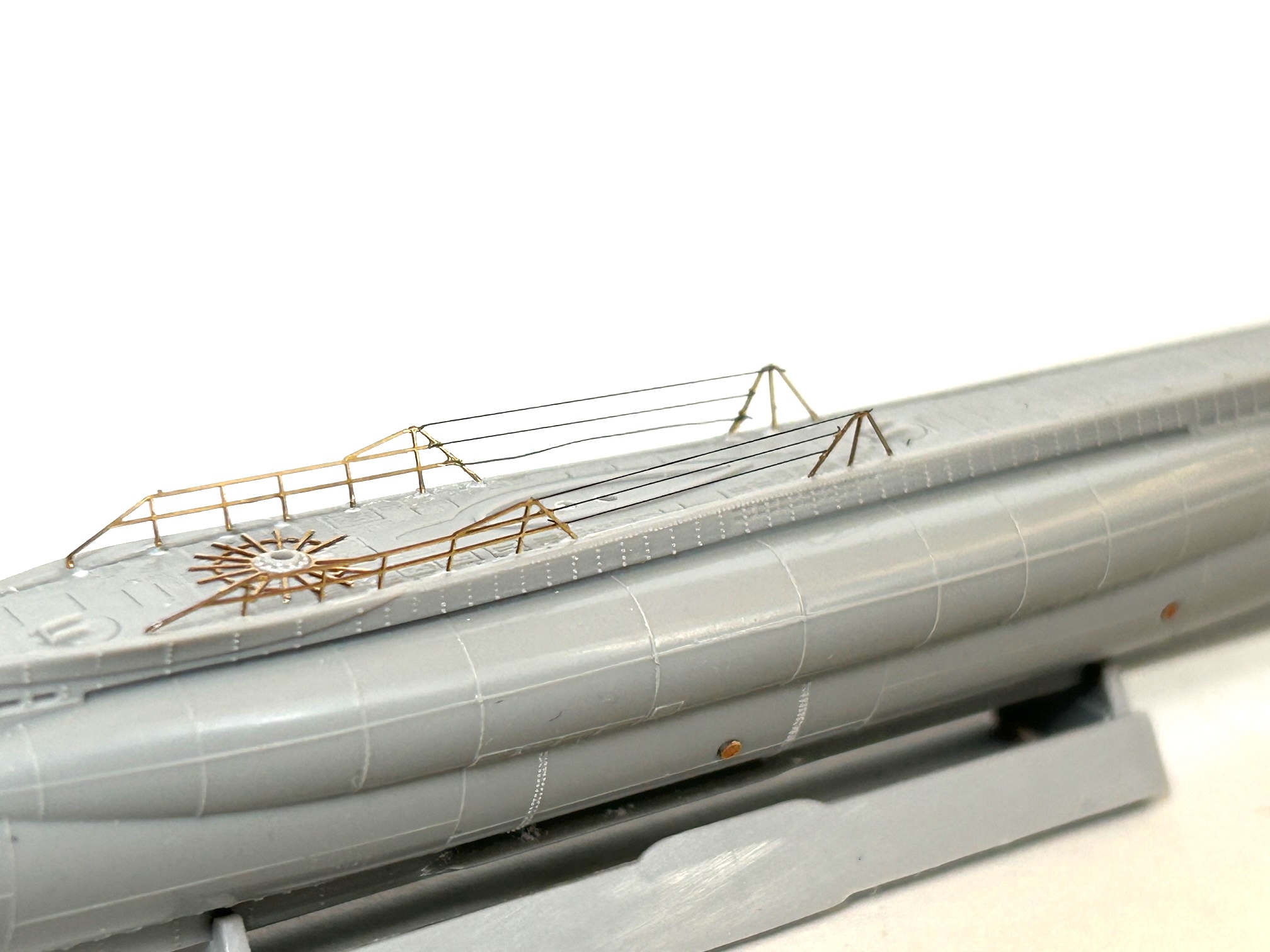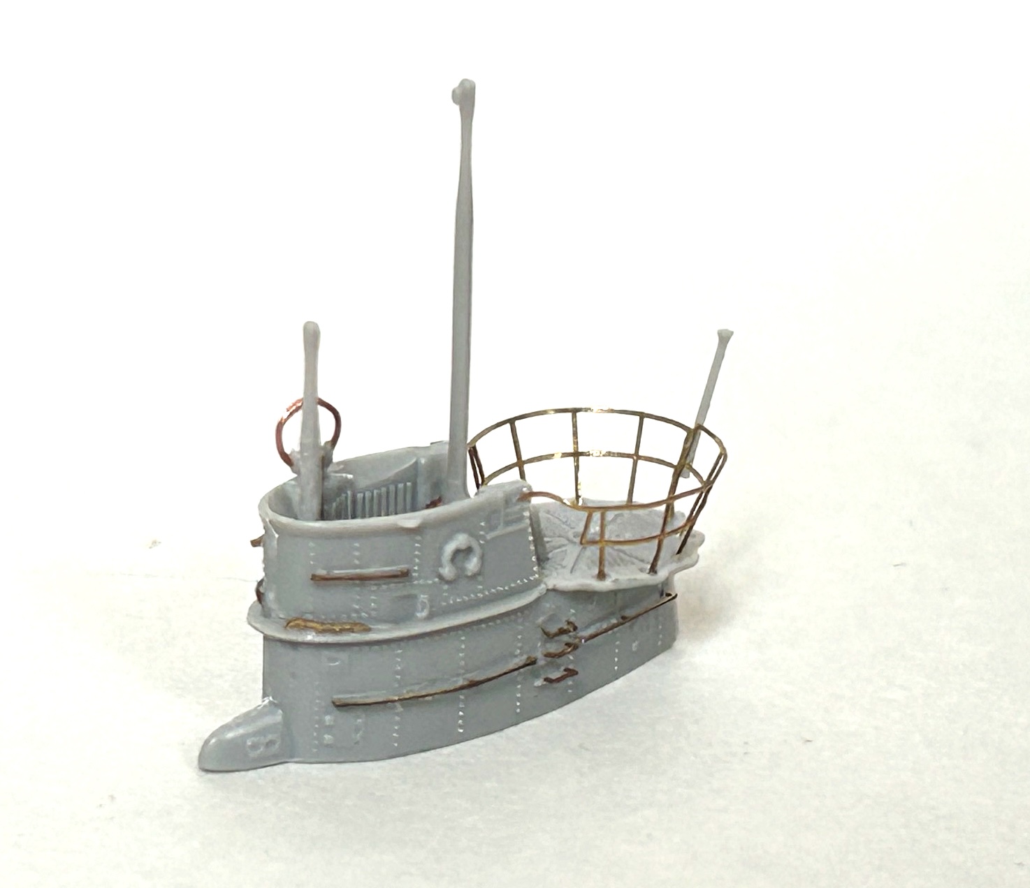 Die Konstruktion am Bug, mit dessen Hilfe Sperrseile durchschnitten werden konnten, war als nächstes an der Reihe und auch das ging einfacher von der Hand als befürchtet. Allerdings habe ich danach bemerkt, dass ich mehrfach den Atem angehalten habe. Das scheint hilfreich zu sein, wenn man kleine Teile verklebt. Für das Auftragen der winzigen Tröpfchen Superkleber nutze ich Akupunkturnadeln. Das funktioniert bestens! Auch bei den beiden Halterungen am Heck verlief alles problemlos. Die wirkliche Herausforderung bei diesem Modell bestand darin, die winzigen Haltegriffe an den Turmseiten anzubringen. Zum einen sind diese extrem klein und zum anderen müssen sie auch noch stumpf ohne Aufnahmepunkte angeklebt werden. Diese Aktion kostete mich einen ganzen Abend, aber auch das war dann endlich geschafft. Die Rundantenne habe ich noch durch einen dünnen Kupferdraht ersetzt und dann noch den kleinen „Wintergarten“ aus den beiden Ätzteilen angefertigt und angeklebt.