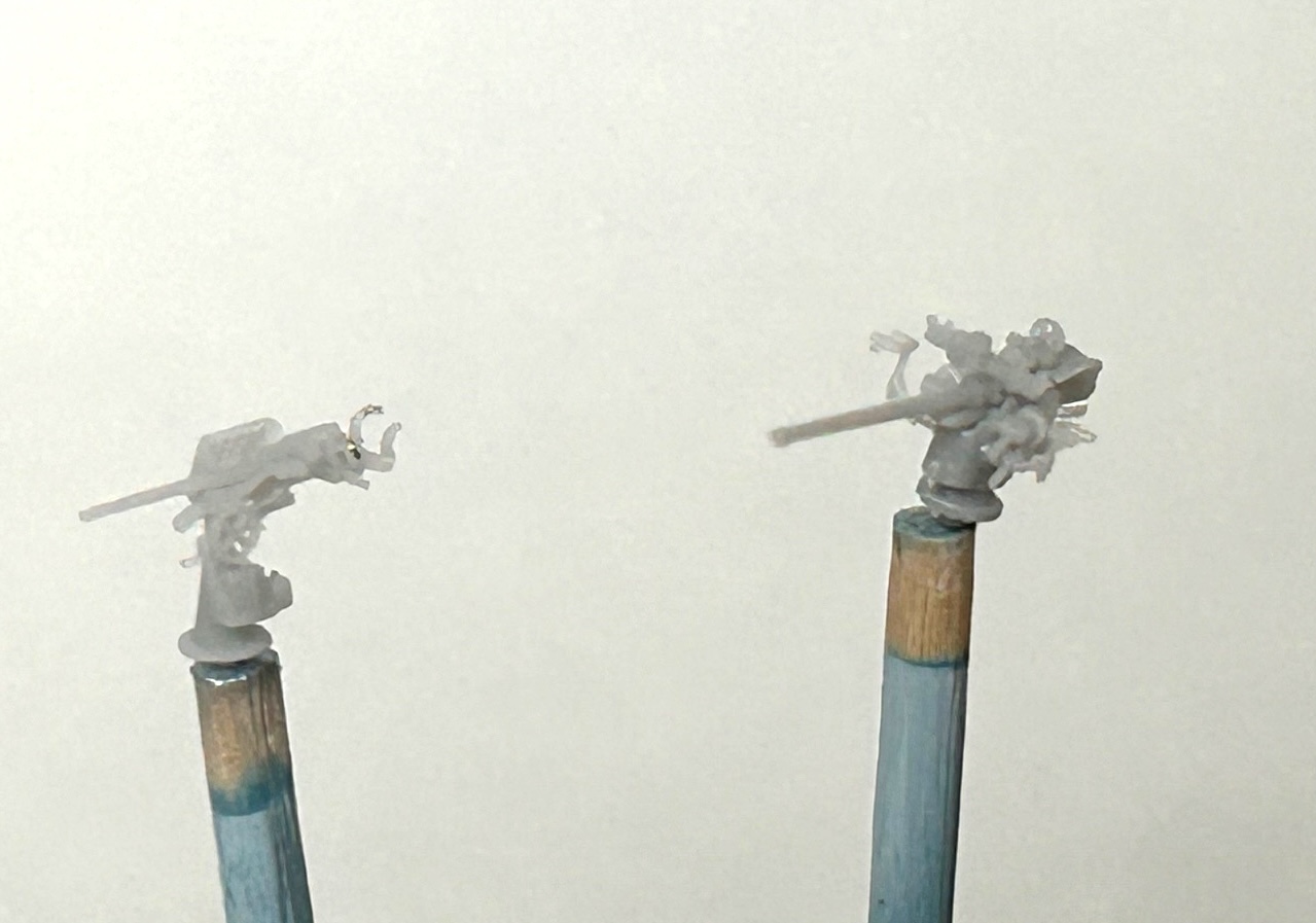 Im Anschluss daran bereitete ich die beiden Bordwaffen vor. Hier ist äußerste Vorsicht geboten, wenn man die Teile von den Druckstreben löst, denn insbesondere die Schulterstützen sind extrem fein und zerbrechlich. Bei der 8,8cm Schiffskanone ist noch das Geschütz mit der Lafette zu verkleben.