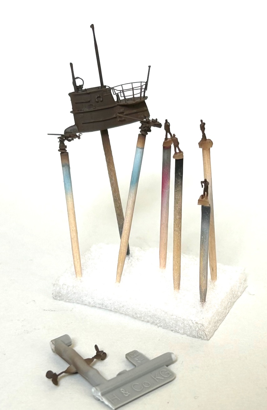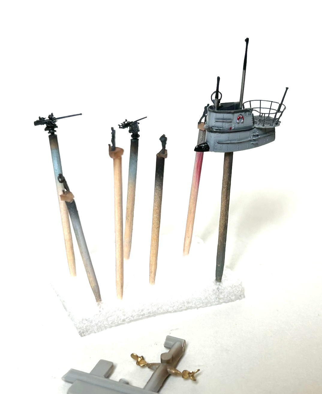 Vor den abschließenden Alterungsaktivitäten am U-Boot habe ich noch vier 3D gedruckte Figuren vorsichtig vom Teileträger gelöst und unter der Lupe bemalt. Die Bemalung von Figuren in 1:350 ist schon eine völlig andere Sache als in 1:35. Allerdings ist es erstaunlich, dass man mit einem leichten Wash mit dunkler Ölfarbenbrühe, auch hier doch noch einige Details herauskitzeln kann.