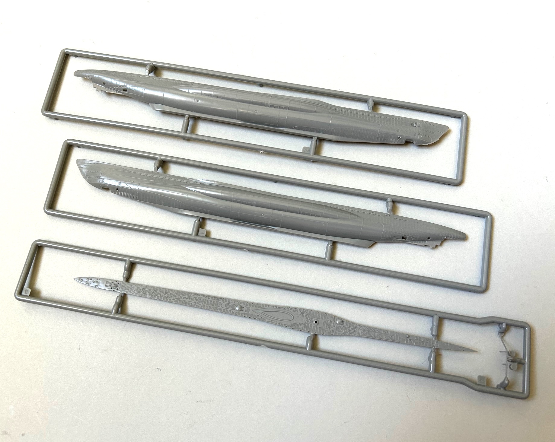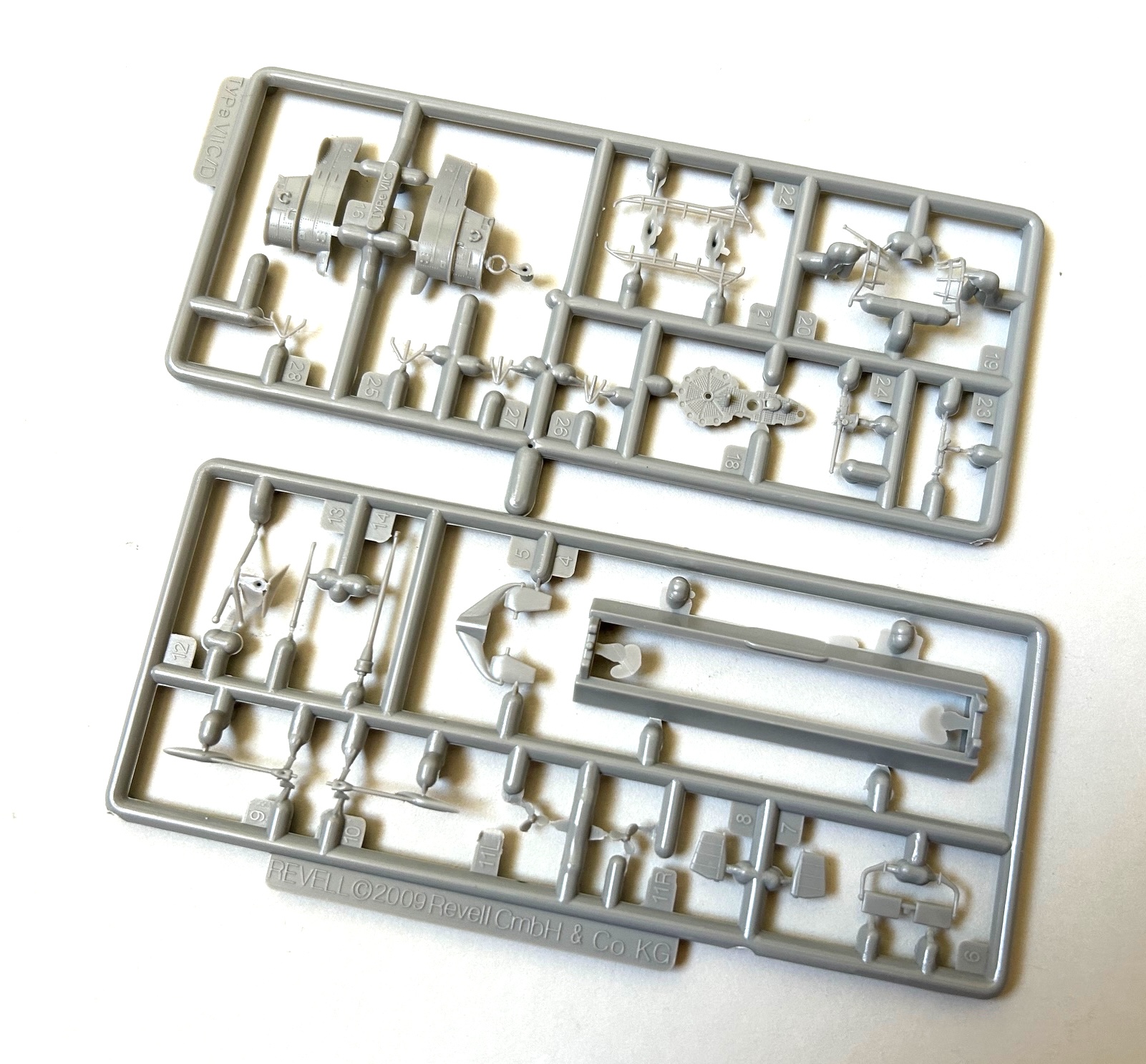 Vom Typ VII gibt es in 1:350 einige Bausätze, die ich fast alle in meiner Sammlung habe. Allerdings wollte ich für dieses Vorhaben den sehr einfach wirkenden uaber wirklich beeindruckend günstigen (ca 17 Euro) Bausatz von Revell nutzen. Dieser besteht aus fünf Gussästen in hellgrauem Plastik, wovon 3 dem Rumpf, einer dem Turm und weiteren Aufbauten und der fünfte in erster Linie den Antriebsteilen gewidmet ist.