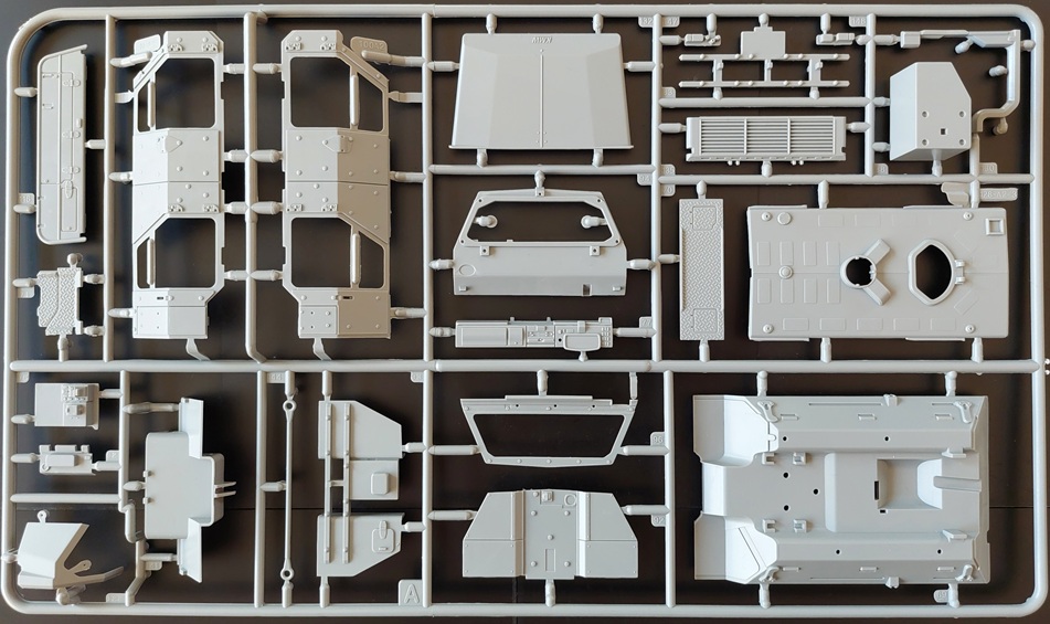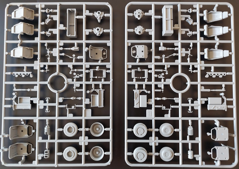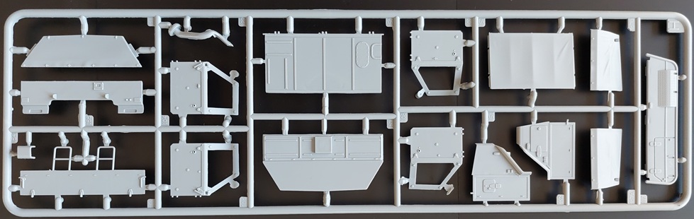 Bausatz: Die ursprüngliche Form dieses sehr interessanten Fahrzeugs der Bundeswehr stammt aus dem Jahr 2013 und wurde in den Jahren 2015 und 2019 durch neue Bauteile ergänzt. Geliefert wird der aus 237 Teilen bestehende Bausatz in der zwar stabilen, aber unpraktisch zur Seite zu öffnenden Schüttbox. Im Karton finden wir sicher in Folie verpackt acht Gießäste aus grauem Kunststoff, zwei aus transparentem Kunststoff, vier Reifen aus Gummi, einen kleinen Bogen mit Abziehbildern, einen Draht zu Darstellung der Antennen sowie die Bauanleitung. Die Teile machen dabei insgesamt einen guten Eindruck. Zwar findet man hier und da ein paar Auswerfermarken, aber diese sind ohne großen Aufwand zu entfernen.