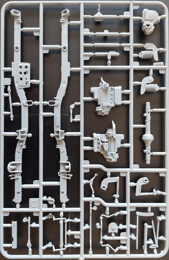 Über die Passgenauigkeit kann ich aus eigener Erfahrung und durch Austausch mit anderen Modellbauern berichten, das es ein paar Probleme im vordere Bereich beim Übergang von Fahrgastzelle zur Motorhaube gibt. Insgesamt aber nichts, was man nicht bewerkstelligen kann. Ansonsten weisen die Bauteile schöne Strukturen auf, die das Auge des Betrachters erfreuen. Der Fahrzeugrahmen wird aus mehreren Teilen zusammengesetzt, was genaues Arbeiten erfordert, um sich nicht weitere Probleme zu schaffen. Der Bausatz glänzt mit einer Motornachbildung sowie einem kompletten Antriebsstrang. Alle Türen und auch die Motorhaube können geöffnet oder geschlossen gebaut werden. Der geöffnete Bau der Türen bietet sich an, da auch eine sehr schöne Inneneinrichtung enthalten ist. Die Klarsichtteile haben ihren Namen auch verdient und lassen auch einen Blick auf die schöne Innenausstattung zu.