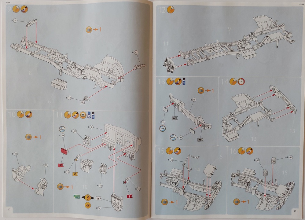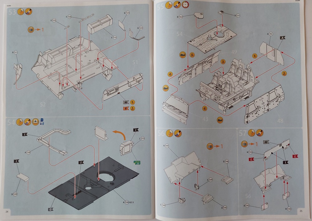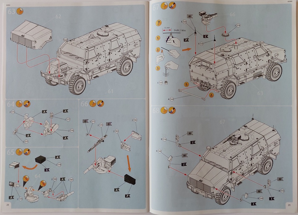 Bauanleitung/Bemalung: Die Bauanleitung liegt dem Bausatz als farbiges Heft im Format A4 vor. In 69 Baustufen, inklusive der Bemalung, wird der Modellbauer durch den Bau begleitet. Die einzelnen Bauschritte sind dabei sehr übersichtlich gehalten. Es sollten daher eigentlich keine Fragen offen bleiben. In den einzelnen Bauschritten sind zum Teil auch Farbangaben für einzelne Bauteile/Baugruppen enthalten, was ich sehr schön finde.