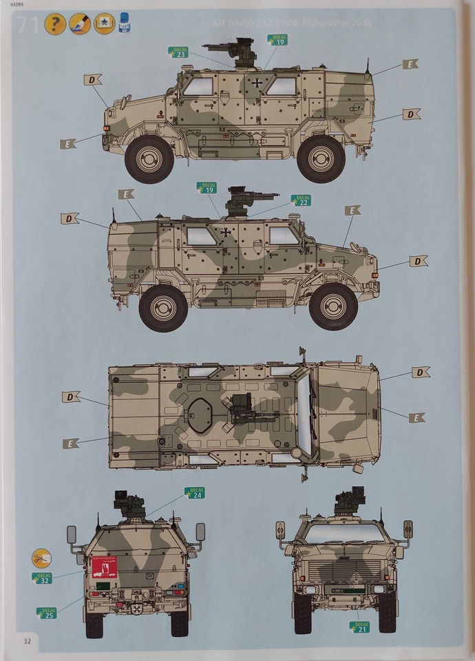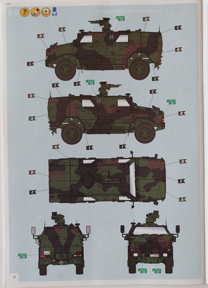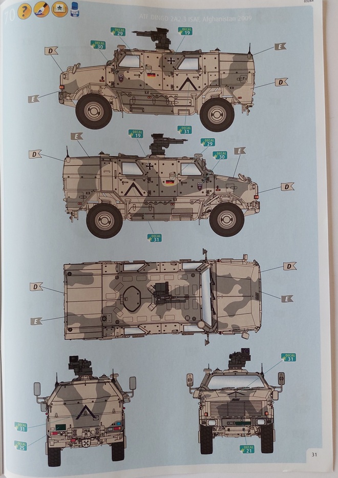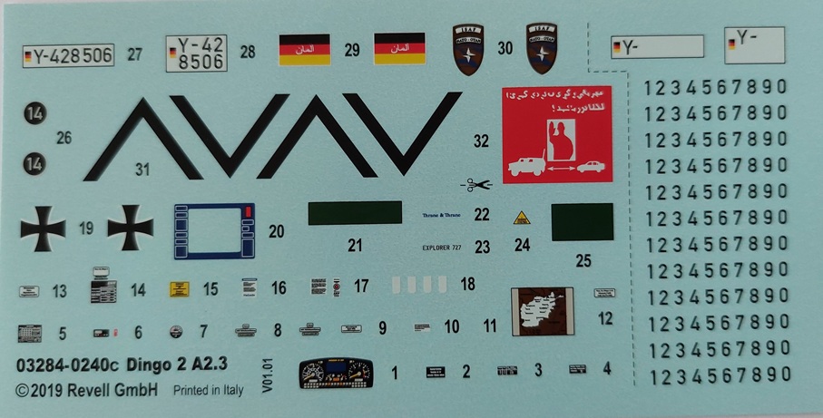 Revell stellt drei Bemalungsvarianten zur Wahl. Einmal in Nato-Dreifarb-Tarnung und zwei Fahrzeuge, die 2009 bzw. 2010 in Afghanistan im Einsatz waren. Die Farben sind dabei aus dem hauseigenen Programm, inklusive der revell’schen Mischanleitung für einzelne Farben. Der enthaltene Decalbogen ist mit dem Prädikat „Klein, aber fein“ zu versehen. Er wurde im Jahr 2019 randlos gedruckt und ist, wie ich feststellen konnte, sehr angenehm zu verarbeiten.