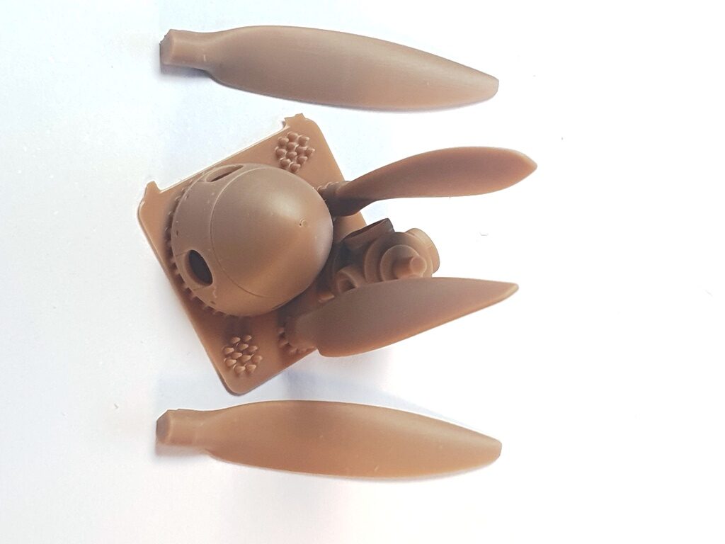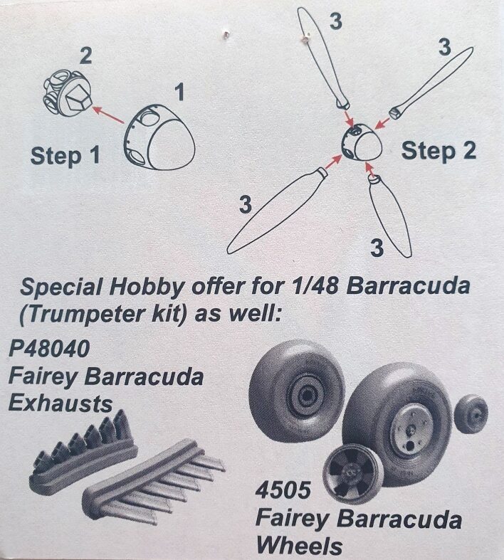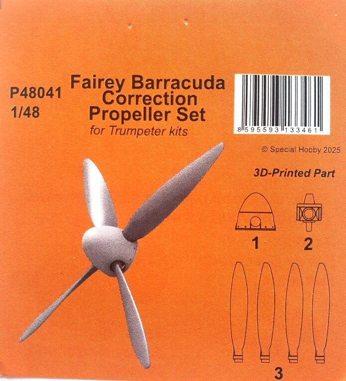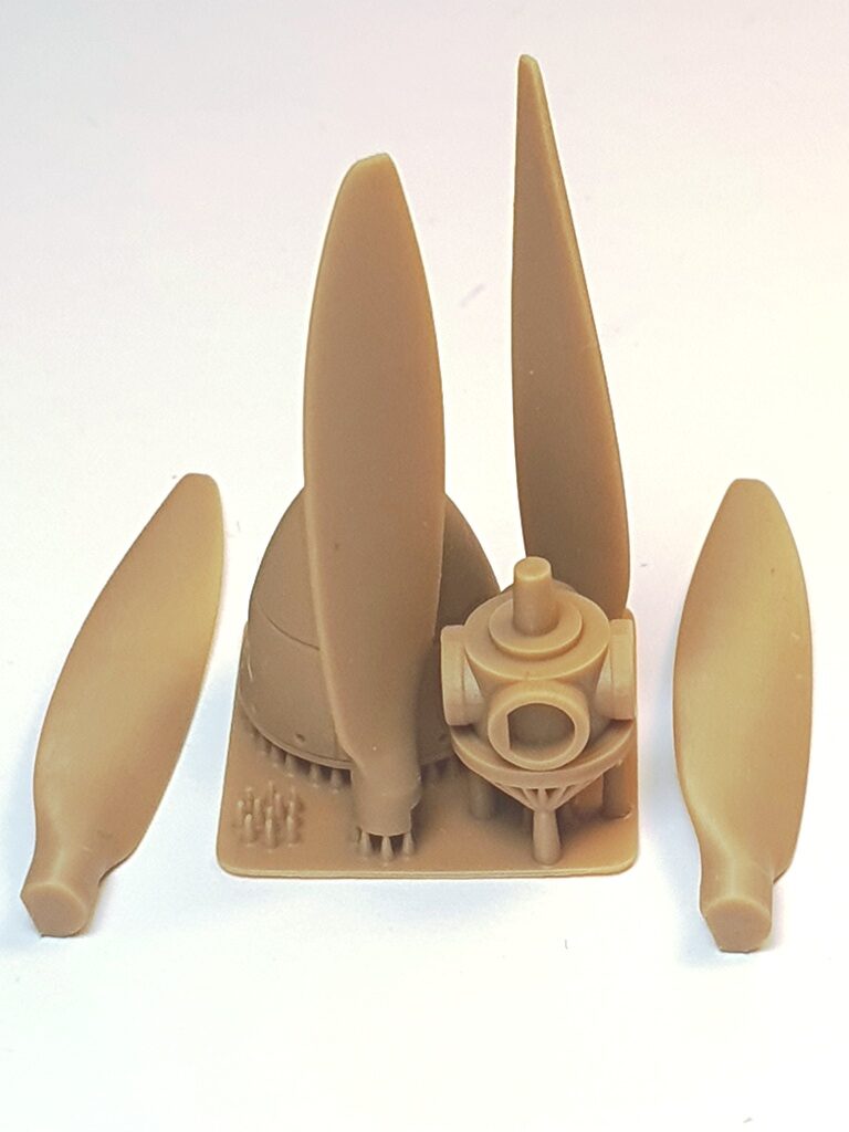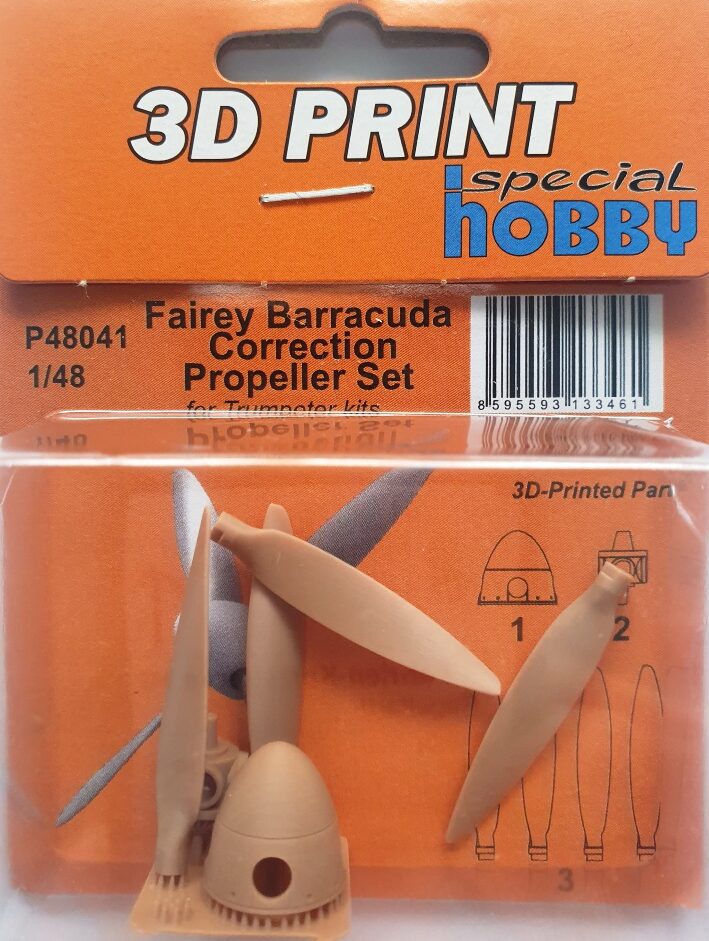 Set: Zum Trumpeter-Kit der Fairey Barracuda bringt Special Hobby aus der Tschechei ein Propeller-Set zur Korrektur und Verfeinerung heraus. In milchkaffeebraunem Resin sind vier Propellerblätter, eine Propellernabe und ein hohler Spinner sauber gedruckt in der bekannten Klarsichtbox zu finden. Eine kleine Bauanleitung zeigt, wie zunächst die Nabe in den Spinner zu kleben ist und dann die Propellerblätter durch die Öffnungen im Spinner in den Aufnahmen der Nabe zu fixieren sind. Damit die Propellerblätter die richtige Stellung erhalten, sind die Aufnahmen mit kleinen Vorsprüngen der Wände versehen, die mit Einkerbungen an den Blättern korrespondieren, sehr gut! Zwei der Propellerblätter waren leider lose, haben aber keinen Schaden erlitten. Vielleicht sollte der Hersteller hier auf eine stärkere Fixierung achtgeben, etwa so, wie es Eduard bei seinen Brassin-Sets tut. Die Teile sind ansonsten sehr sauber gedruckt, man findet keine Riefen oder andere Qualitätsmängel. Die Teile ersetzen die entsprechenden Spritzgussteile des Kits und dürften somit einfach zu verwenden sein, jedoch ist beim Abtrennen von den Druckstreben Vorsicht geboten und man sollte im Umgang mit Sekundenkleber zum Fixieren etwas Erfahrung haben. Vorarbeiten zum Einbau fallen nicht an.