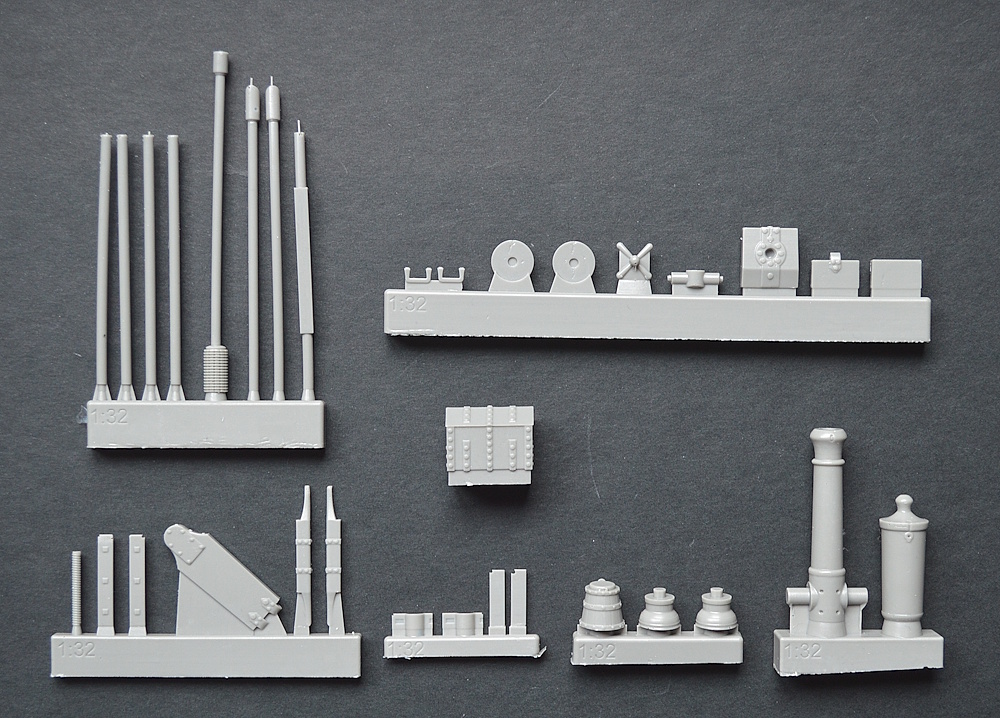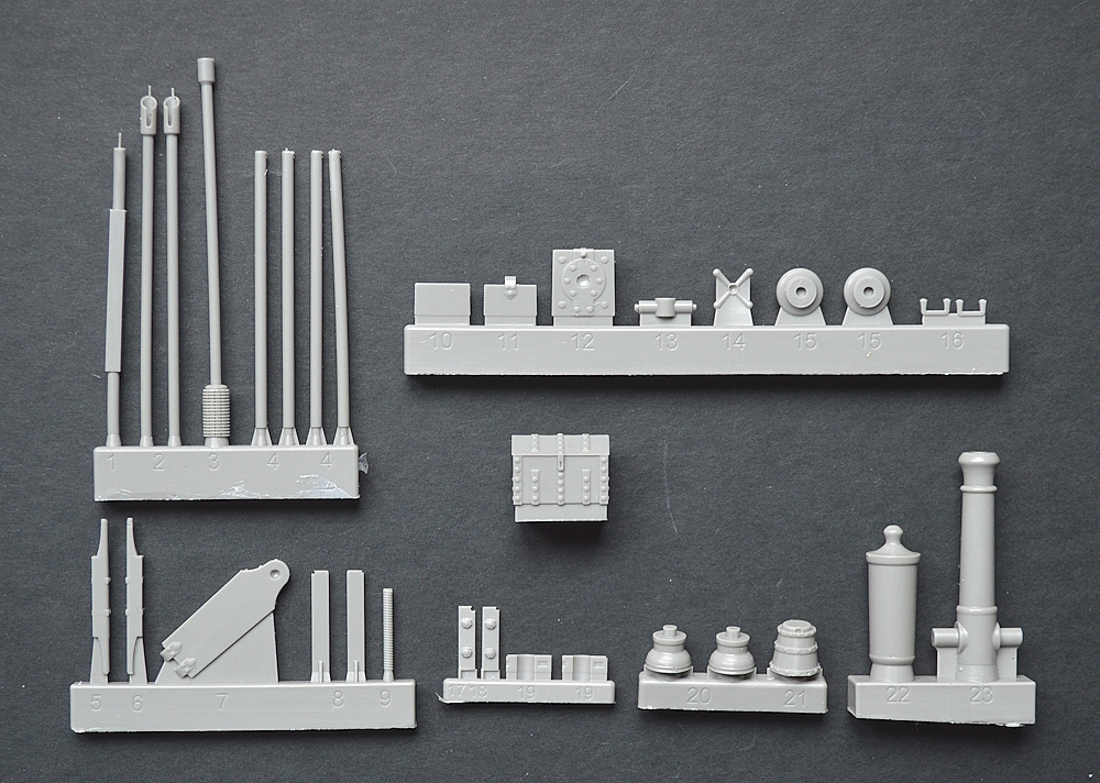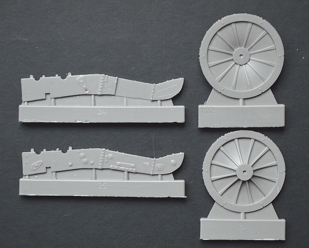 Die Teile werden in einem grauen, ausreichend stabilen Faltkarton geliefert, auf dem ein Aufkleber das fertig gebaute Geschütz zeigt. In dem Karton befinden sich 37 graue, gegossene Resinteile, 4 graue Resindruckteile, ein Fotoätzteilbogen sowie die Bauanleitung. Die Teile sind in Tüten verpackt und zusätzlich durch Schaumstoffpolster gegen Beschädigungen geschützt. Die Resinteile sind in 3D erstellt und gedruckt worden, wobei bis auf zwei Ausnahmen alle Teile als Resinabgüsse vorliegen. Der Guss fällt sauber aus. Es sind kaum Blasen oder Fischhäute vorhanden. Jedoch wurden bereits im 3D-Druck einige Formtrennwände eingebaut, die es am Modell zu entfernen gilt. Leider treten diese auch an einigen detaillierten Unterseiten wie denen der Räder und Lafetten auf, weshalb beim Versäubern besondere Vorsicht geboten ist. Die 3D-Druck-Schichtlinien sind an einigen Güssen noch erkennbar und müssen ebenfalls nachbehandelt werden. Verzug tritt nur bei einigen wenigen schmalen Teilen auf. Betroffen sind hier vor allem die Wischstöcke. Ein warmes Wasserbad und vorsichtiges Biegen sollten hier reichen. Die Teile zeigen, dass Hauler großen Wert auf Details gelegt hat. Die gut gestalteten Resinteile werden an Stellen, wo der Guss nicht mehr stabil genug gewesen wäre, um Ätzteile ergänzt. Das wird sich später, etwa beim Transport des fertigen Modells, als nützlich erweisen.
