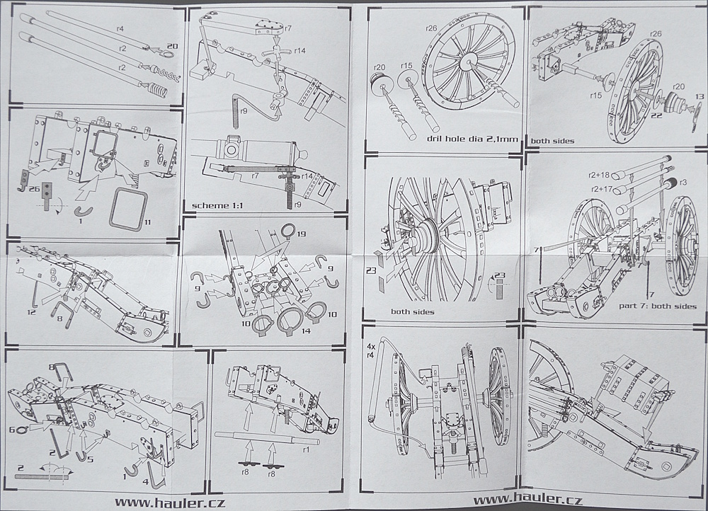 Die Bauanleitung besteht aus einem etwa DIN-A4-großen schwarz-weiß bedruckten Blatt. Der Zusammenbau wird in 17 Schritten dargestellt. Hinweise zur Bemalung gibt es in der Anleitung mit allgemeinen Farbangaben (französisches Artilleriegrün, Schwarz und Bronze) ohne Bezug zu einem modernen Farbsystem – das ist bei vielen Herstellern historischer Figuren so üblich. Zudem hilft die farbige Abbildung auf dem Karton. Auf der Herstellerseite sind diese Bilder des gebauten Geschützes zu sehen: