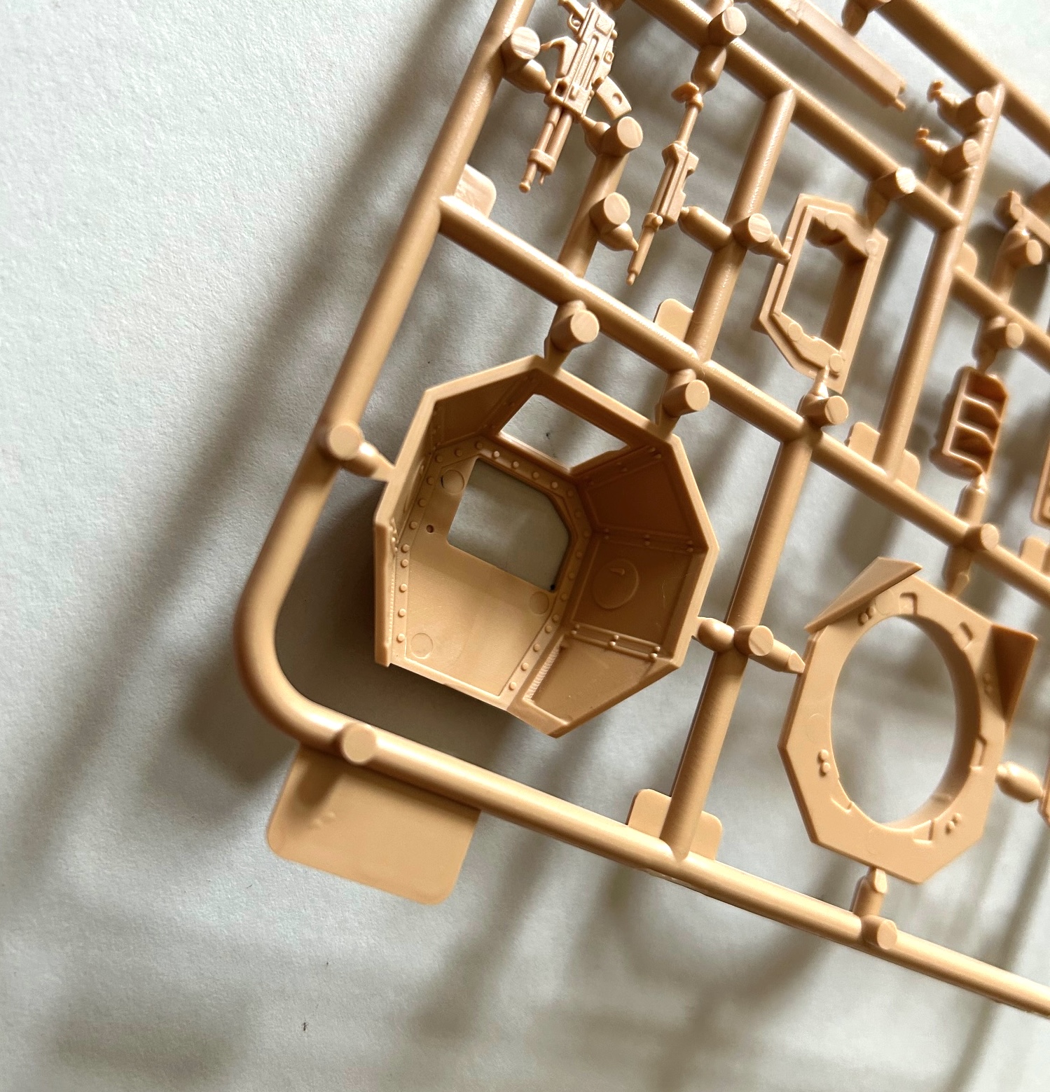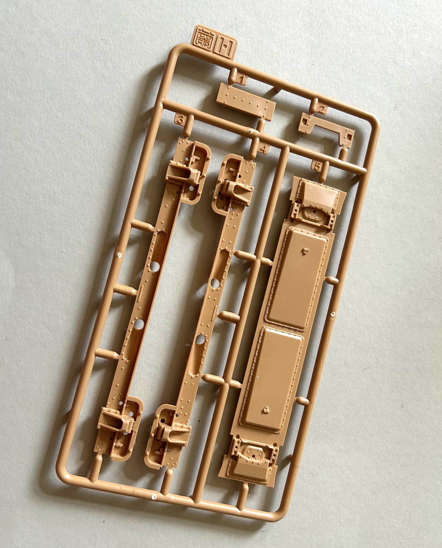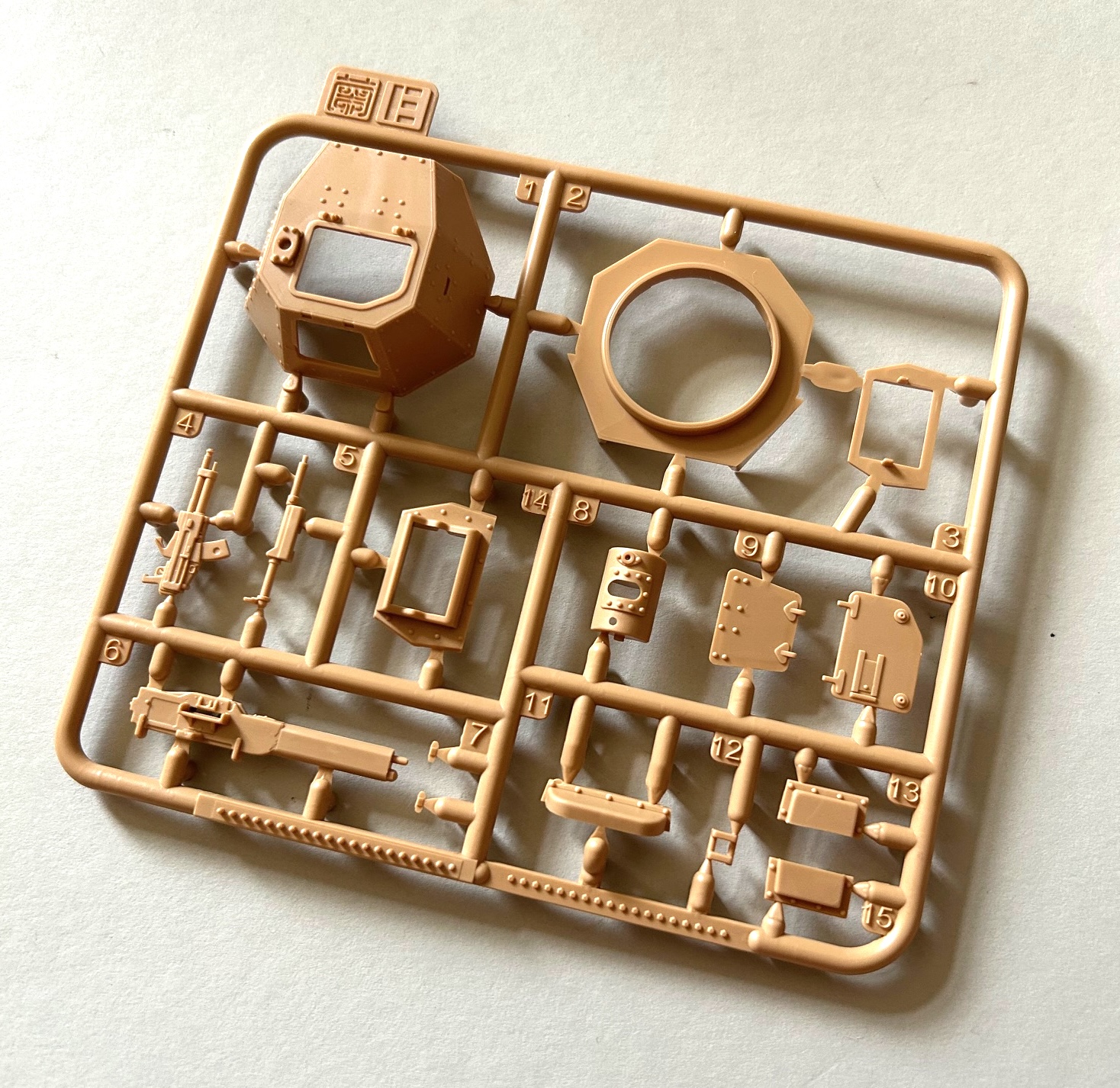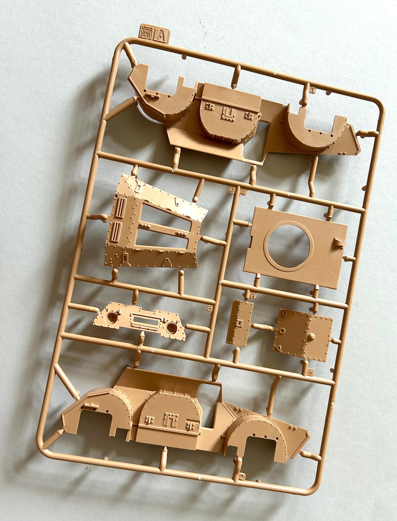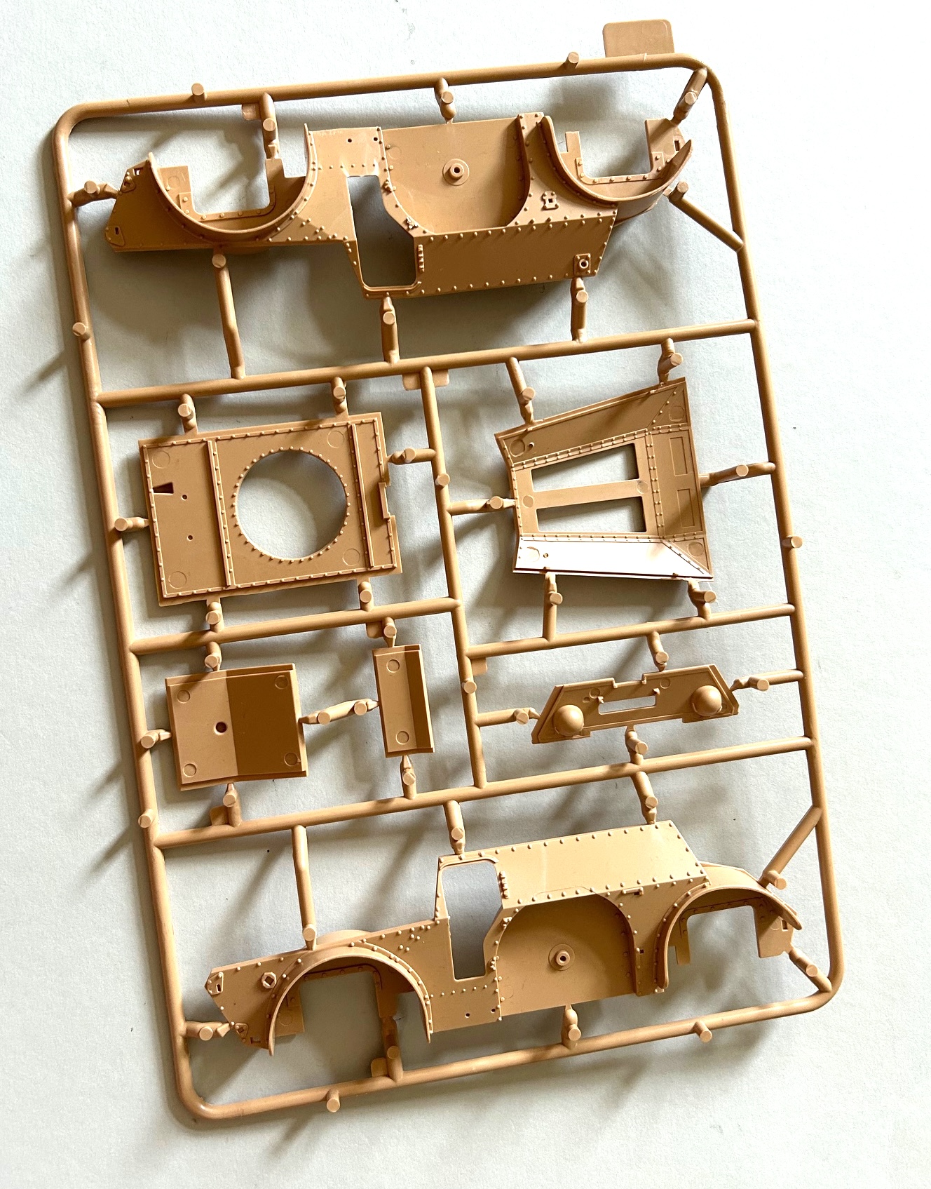 Die Qualität der Bauteile ist als sehr gut zu bezeichnen und auf den ersten Blick glaubt man – auch wegen der Farbe der Spritzlinge – einen Bausatz von Tamiya in Händen zu halten. Ob dies dann auch für die Passgenauigkeit gilt, wird sich beim Zusammenbau zeigen. Auswerfermarken sind vorhanden, aber lediglich in Bereichen, die man später am fertigen Modell nicht mehr einsehen kann. An den Innenseiten von Turm und dem Fahrzeugaufbau findet man diverse Nieten und Aufnahmebereiche für die separat erhältlichen Teile der Inneneinrichtung, worüber in einem separaten First Look informiert wird.