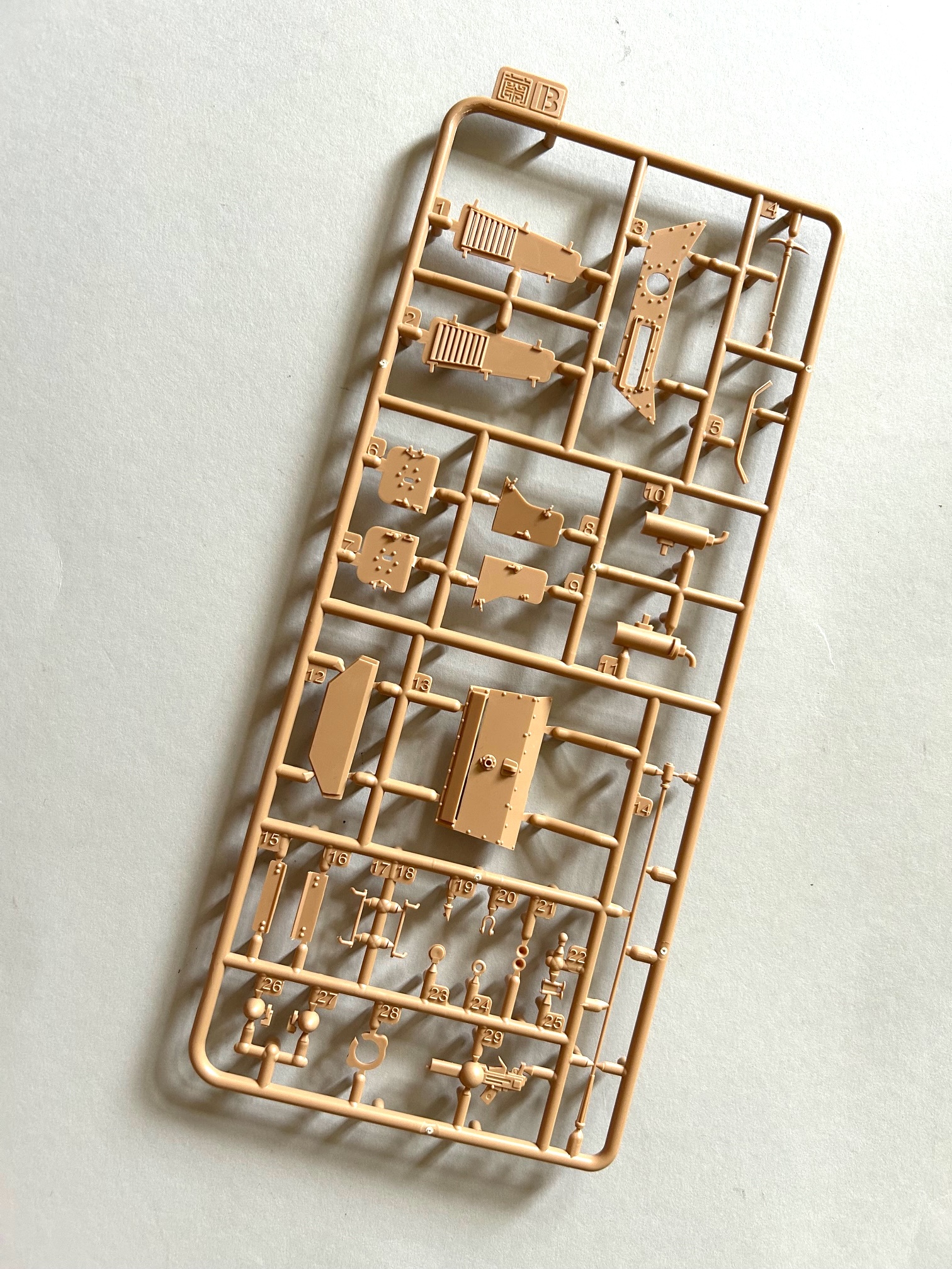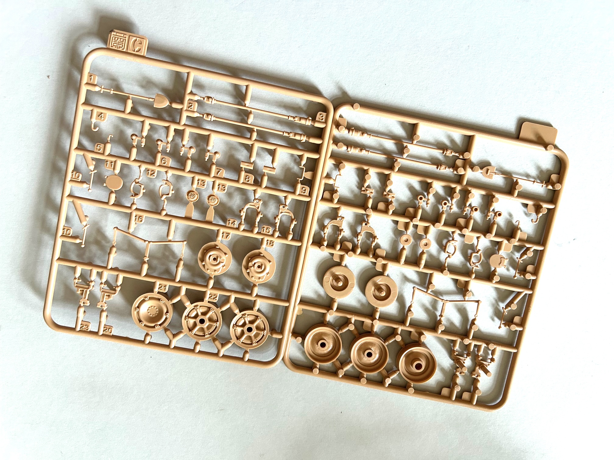 Die Bausatzteile befinden sich im Inneren eines stabilen Stülpkartons, dessen Deckel eine sehr professionell ausgeführte Grafik des Fahrzeuges in Wüstenumgebung ziert. Als Inhalt findet man sechs Spritzlinge aus cremegelben Plastik, drei aus schwarzem Plastik für die Reifen, einen klaren Gussast, einen Ätzteilebogen, Metallfedern, Metallröhren für die Rohre der Haupt- und Nebenwaffen, einen Bogen mit Abziehbildern, den Bauplan sowie ein Abdruck eines historischen Werbeplakates im Format DIN A5. In aktuellen Bausätzen liegt darüber hinaus ein Revisionsblatt für den Bauplan inklusive 3D gedruckte Teile für die obere Abdeckung des Fahrzeuges und noch zwei Luken bei.