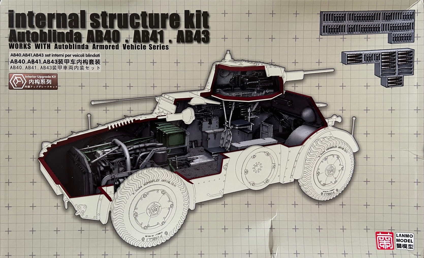 Der Bausatz: Passend für die bereits im Markt befindlichen Bausätze der italienischen Spähfahrzeuge AB40 und AB41 bietet der chinesische Hersteller Lanmo Model bzw. Heavy Hobby einen kleinen Bausatz für die Inneneinrichtung an. Das wirklich Tolle dabei ist, dass dieses Set zum einen perfekt auf den Basisbausatz abgestimmt ist und zum anderen, dass man hier nicht viel mehr als 15 Euro dafür bezahlen muss.