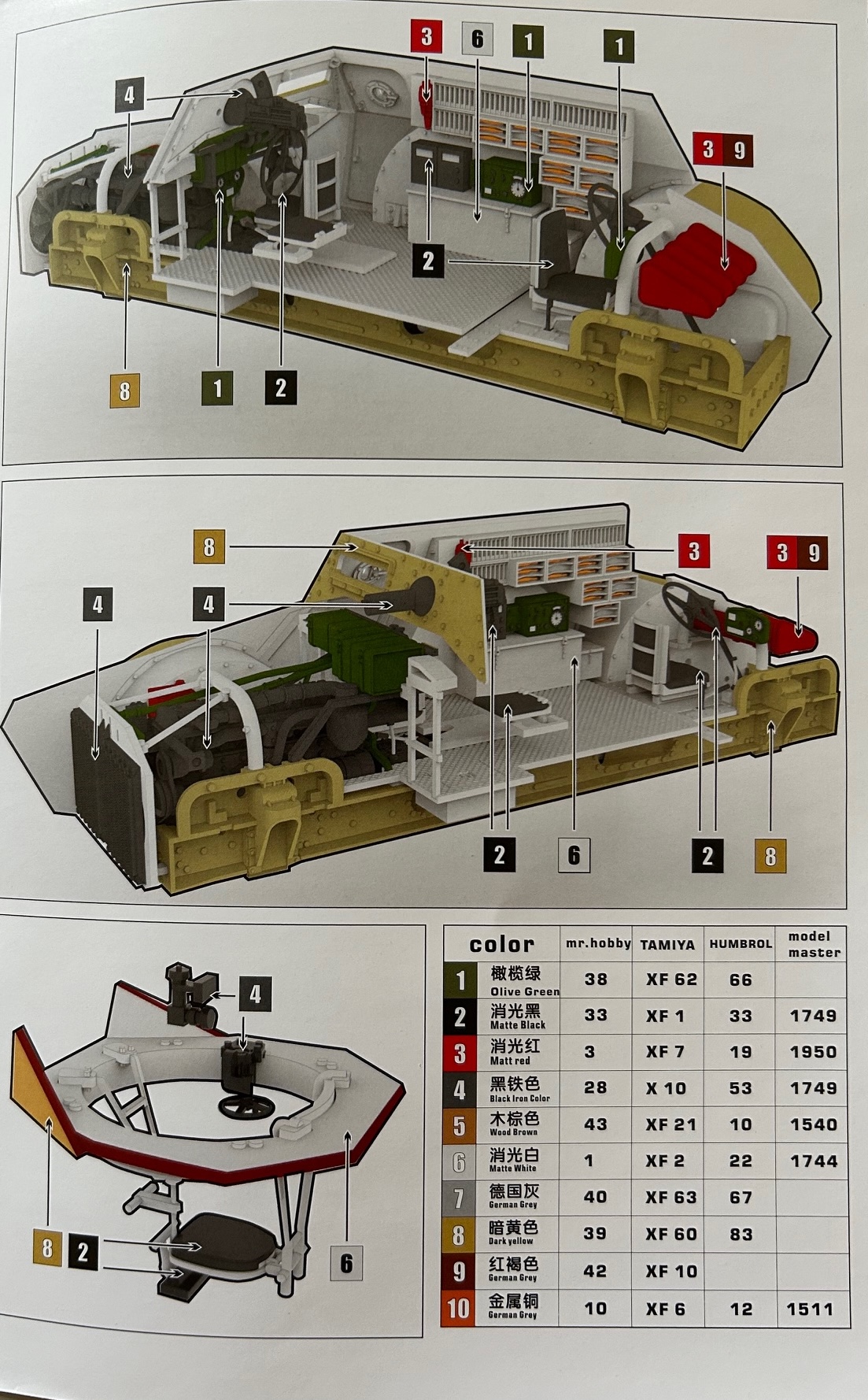 Für die Bemalung der Bauteile findet man Farbangaben der Paletten von Mr. Hobby, Tamiya, Humbrol und Model Master.